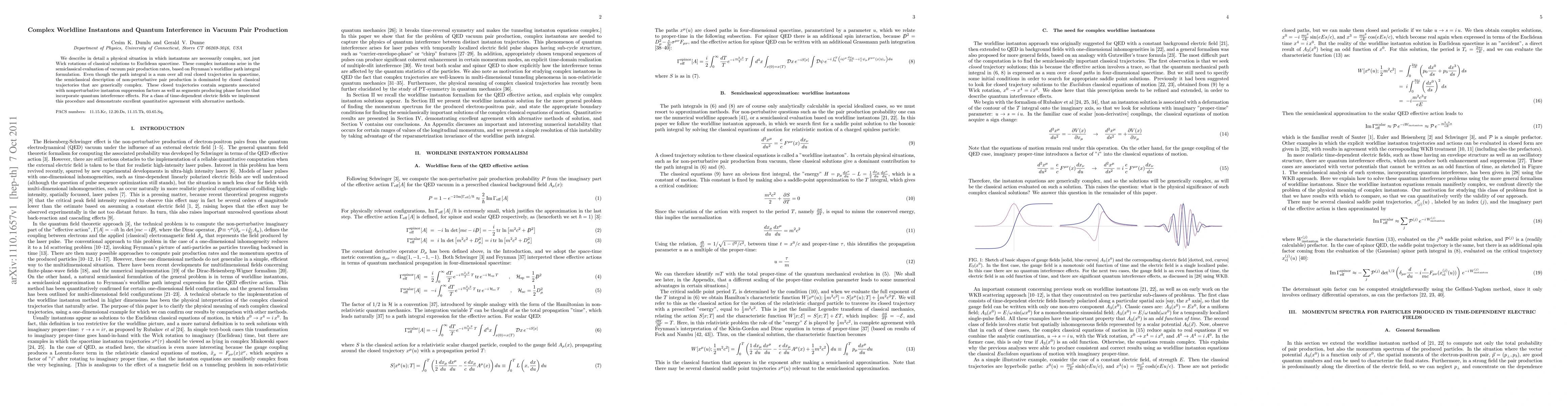 This paper explores complex worldline instantons in vacuum pair production, showing that these complex trajectories, rather than simple Wick rotations, dominate the semiclassical evaluation. It demonstrates quantum interference effects and nonperturbative suppression factors through a detailed analysis of time-dependent electric fields.