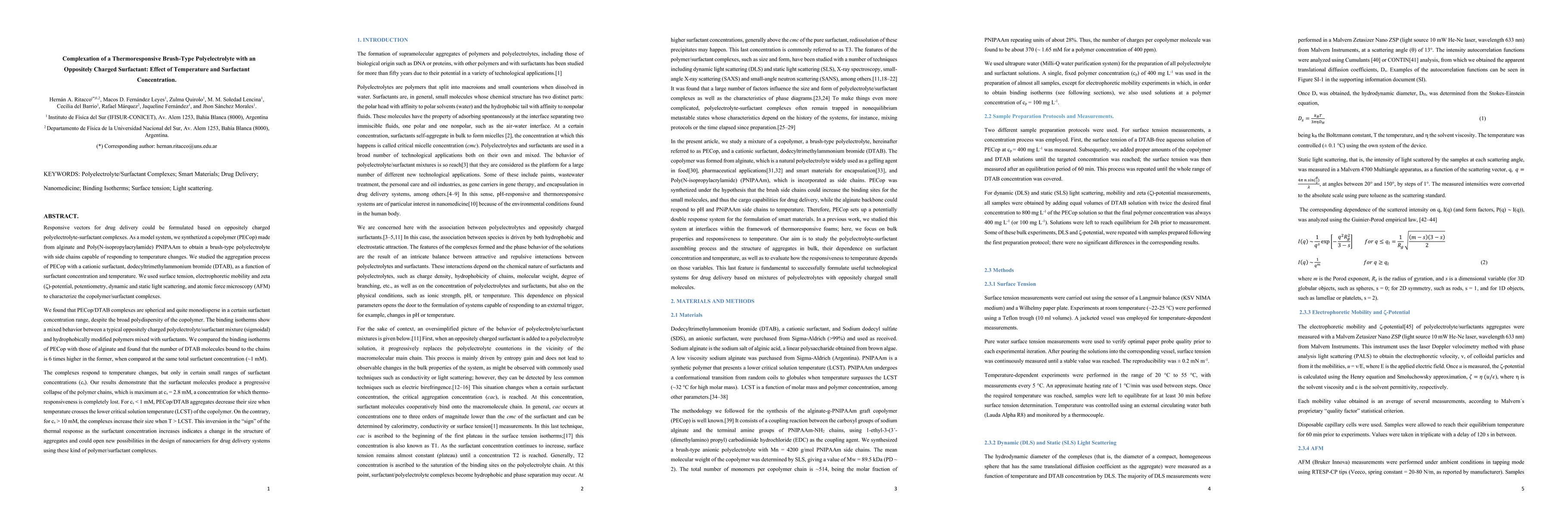 Responsive drug delivery vectors can be designed using oppositely charged polyelectrolyte-surfactant complexes. As a model, we created a brush-type copolymer (PECop), combining alginate and Poly(N-isopropylacrylamide) (PNIPAAm), whose side chains respond to temperature. Aggregation of PECop with the cationic surfactant dodecyltrimethylammonium bromide (DTAB) was examined versus surfactant concentration and temperature. We used surface tension, electrophoretic mobility, zeta potential, potentiometry, light scattering, and atomic force microscopy to analyze the complexes. PECop/DTAB complexes form spherical, monodisperse aggregates in certain surfactant ranges, even though the copolymer itself is polydisperse. The binding isotherms combine features of oppositely charged polyelectrolyte/surfactant systems and hydrophobically modified polymers. Compared to alginate alone, PECop binds six times more DTAB at 1 mM surfactant concentration. Temperature responsiveness depends on surfactant concentration (cs). The surfactant triggers progressive collapse of polymer chains, maximized at cs = 2.8 mM, where thermo-responsiveness is lost. For cs 10 mM, size increases above LCST. This inversion in thermal response with rising surfactant concentration suggests changing aggregate structure, offering new avenues for drug delivery system design using these polymer-surfactant complexes.