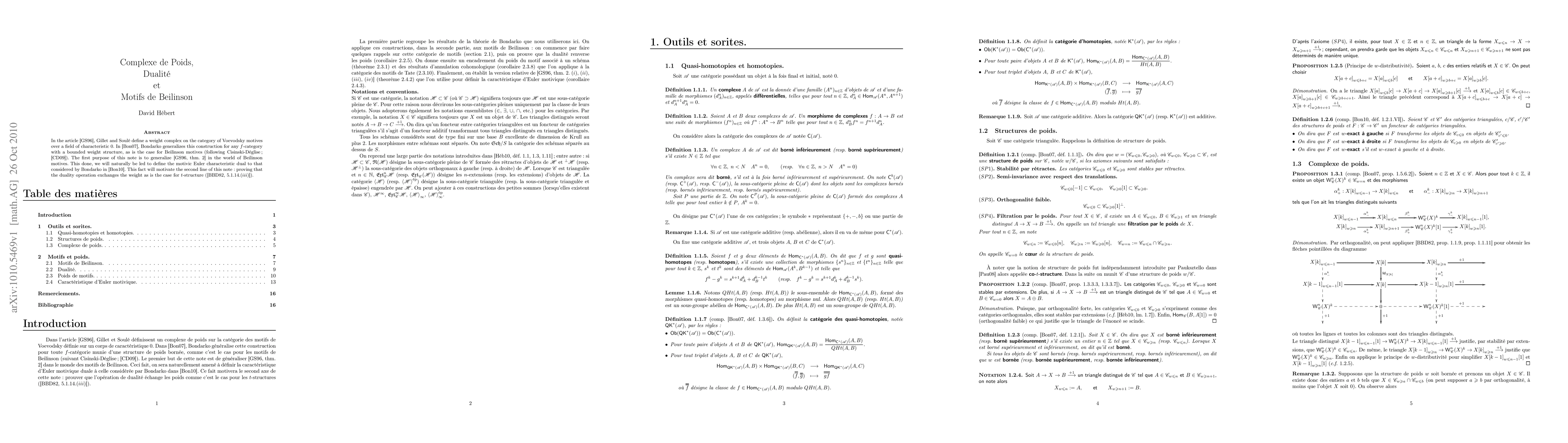 In the article [GS96], Gillet and Soul\'e define a weight complex on the category of Voevodsky motives over a field of characteristic 0. In [Bon07], Bondarko generalizes this construction for any f-category with a bounded weight structure, as is the case for Beilinson motives (following Cisinski-D\'eglise ; [CD09]). The first purpose of this note is to generalize [GS96, thm. 2] in the world of Beilinson motives. This done, we will naturally be led to define the motivic Euler characteristic dual to that considered by Bondarko in [Bon10]. This fact will motivate the second line of this note : proving that the duality operation exchanges the weight as is the case for t-structure ([BBD, 5.1.14.(iii)]). ----- Dans l'article [GS96], Gillet et Soul\'e d\'efinissent un complexe de poids sur la cat\'egorie des motifs de Voevodsky d\'efinie sur un corps de caract\'eristique 0. Dans [Bon07], Bondarko g\'en\'eralise cette construction pour toute f-cat\'egorie munie d'une structure de poids born\'ee, comme c'est le cas pour les motifs de Beilinson (suivant Cisinski-D\'eglise ; [CD09]). Le premier but de cette note est de g\'en\'eraliser [GS96, thm. 2] dans le monde des motifs de Beilinson. Ceci fait, on sera naturellement amen\'e \`a d\'efinir la caract\'eristique d'Euler motivique duale \`a celle consid\'er\'ee par Bondarko dans [Bon10]. Ce fait motivera le second axe de cette note : prouver que l'op\'eration de dualit\'e \'echange les poids comme c'est le cas pour les t-structures ([BBD, 5.1.14.(iii)]).