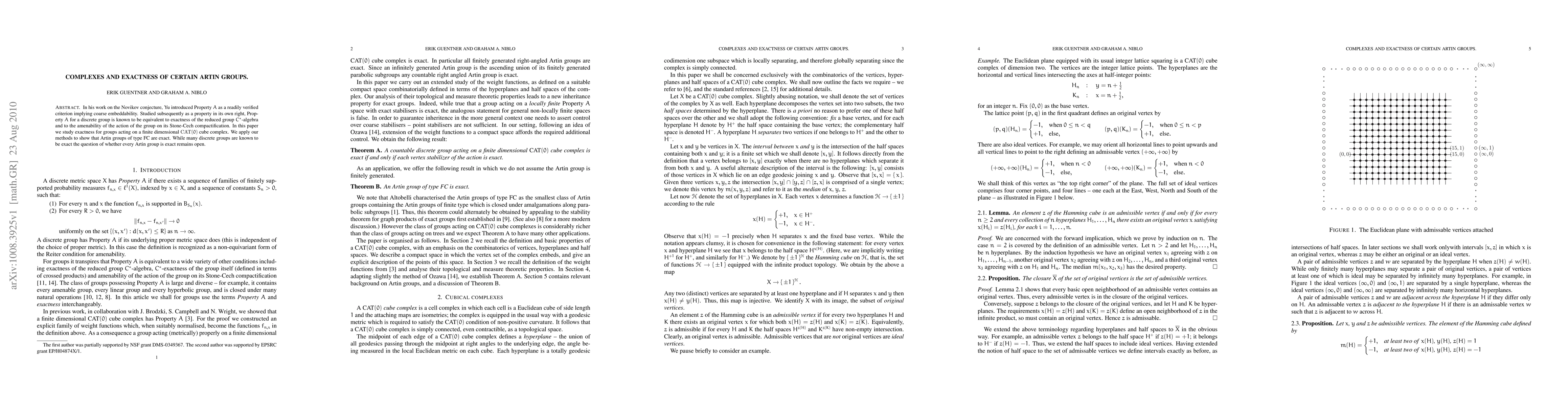 In his work on the Novikov conjecture, Yu introduced Property $A$ as a readily verified criterion implying coarse embeddability. Studied subsequently as a property in its own right, Property $A$ for a discrete group is known to be equivalent to exactness of the reduced group $C^*$-algebra and to the amenability of the action of the group on its Stone-Cech compactification. In this paper we study exactness for groups acting on a finite dimensional $\CAT(0)$ cube complex. We apply our methods to show that Artin groups of type FC are exact. While many discrete groups are known to be exact the question of whether every Artin group is exact remains open.