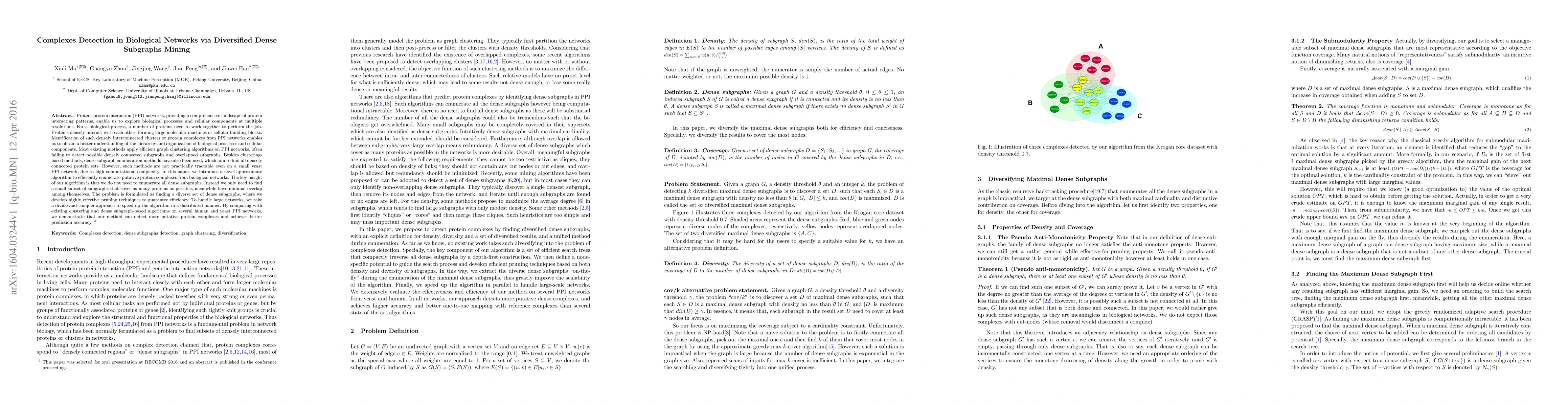 This paper presents an efficient algorithm to identify protein complexes in PPI networks, addressing the limitations of existing clustering and dense subgraph enumeration methods. The proposed approach focuses on finding a diverse set of dense subgraphs, utilizing pruning techniques and a divide-and-conquer strategy for scalability. Results demonstrate improved detection of putative protein complexes with higher prediction accuracy compared to current methods.