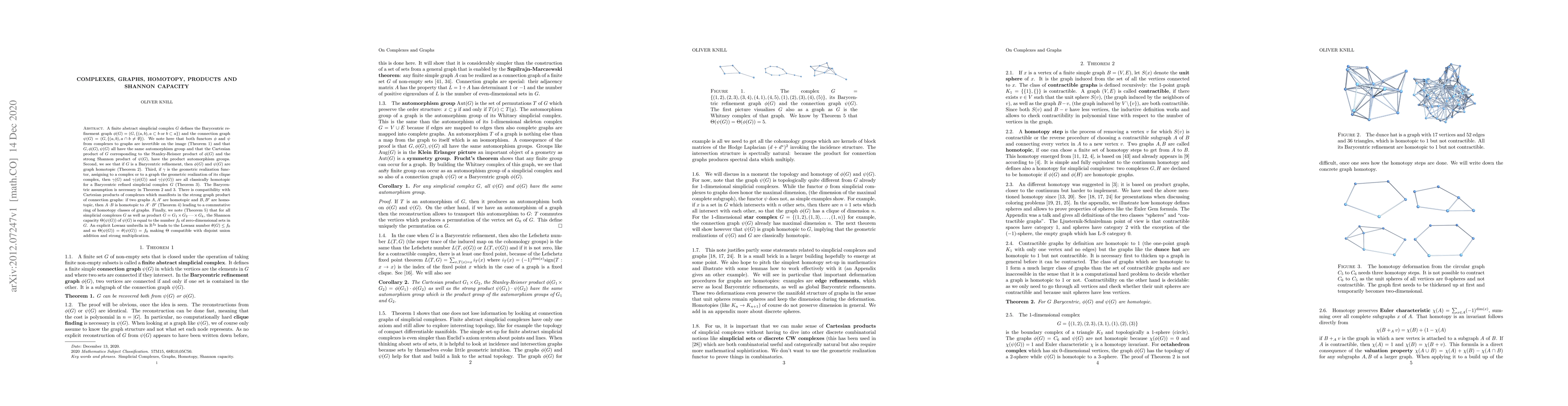 A finite abstract simplicial complex G defines the Barycentric refinement graph phi(G) = (G,{ (a,b), a subset b or b subset a }) and the connection graph psi(G) = (G,{ (a,b), a intersected with b not empty }). We note here that both functors phi and psi from complexes to graphs are invertible on the image (Theorem 1) and that G,phi(G),psi(G) all have the same automorphism group and that the Cartesian product of G corresponding to the Stanley-Reisner product of phi(G) and the strong Shannon product of psi(G), have the product automorphism groups. Second, we see that if G is a Barycentric refinement, then phi(G) and psi(G) are graph homotopic (Theorem 2). Third, if gamma is the geometric realization functor, assigning to a complex or to a graph the geometric realization of its clique complex, then gamma(G) and gamma(phi(G)) and gamma(psi(G)) are all classically homotopic for a Barycentric refined simplicial complex G (Theorem 3). The Barycentric assumption is necessary in Theorem 2 and 3. There is compatibility with Cartesian products of complexes which manifests in the strong graph product of connection graphs: if two graphs A,A' are homotopic and B,B' are homotopic, then A . B is homotopic to A' . B' (Theorem 4) leading to a commutative ring of homotopy classes of graphs. Finally, we note (Theorem 5) that for all simplicial complexes G as well as product G=G_1 x G_2 ... x G_k, the Shannon capacity Theta(psi(G)) of psi(G) is equal to the number m of zero-dimensional sets in G. An explicit Lowasz umbrella in R^m leads to the Lowasz number theta(G) leq m and so Theta(psi(G))=theta(psi(G))=m making Theta compatible with disjoint union addition and strong multiplication.