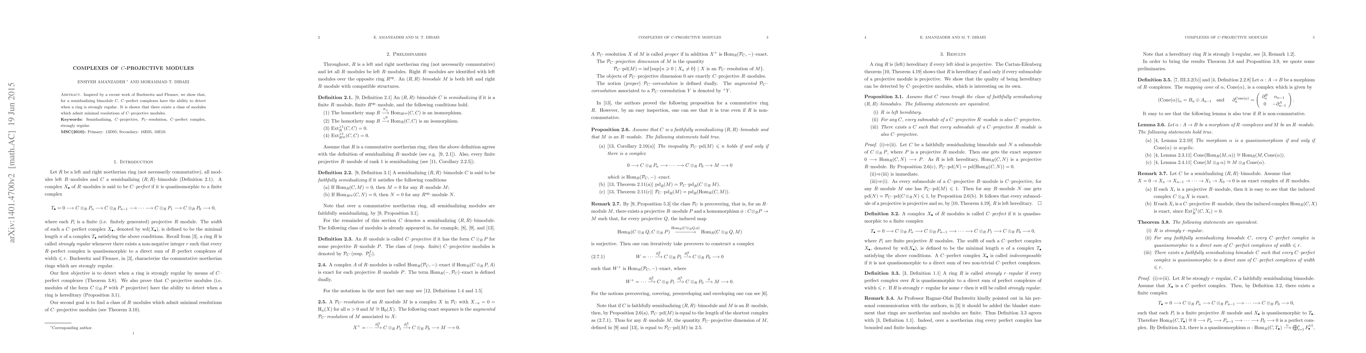 Inspired by a recent work of Buchweitz and Flenner, we show that, for a semidualizing bimodule $C$, $C$--perfect complexes have the ability to detect when a ring is strongly regular. It is shown that there exists a class of modules which admit minimal resolutions of $C$--projective modules.