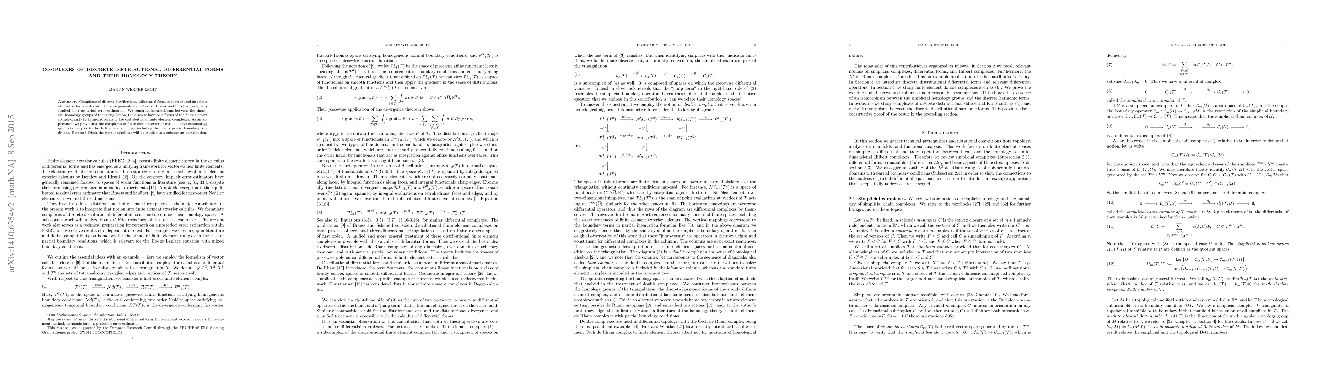 Complexes of discrete distributional differential forms are introduced into finite element exterior calculus. Thus we generalize a notion of Braess and Sch\"oberl, originally studied for a posteriori error estimation. We construct isomorphisms between the simplicial homology groups of the triangulation, the discrete harmonic forms of the finite element complex, and the harmonic forms of the distributional finite element complexes. As an application, we prove that the complexes of finite element exterior calculus have cohomology groups isomorphic to the de Rham cohomology, including the case of partial boundary conditions. Poincar\'e-Friedrichs-type inequalities will be studied in a subsequent contribution.