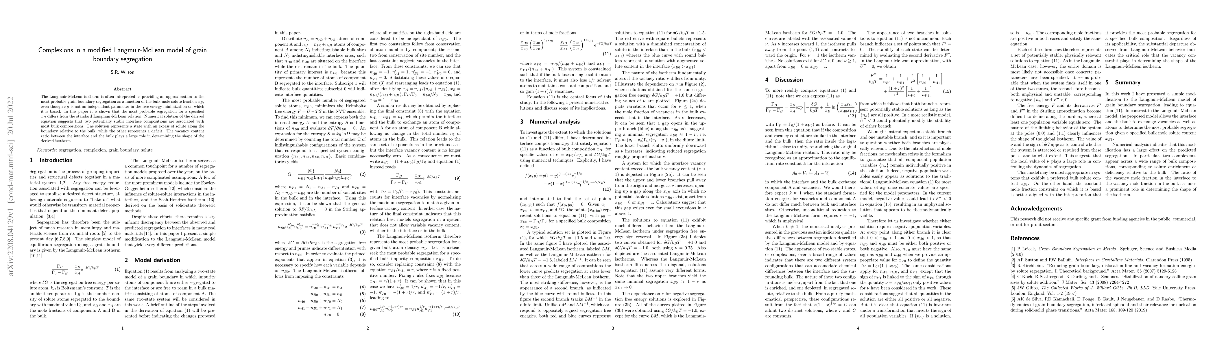 This paper modifies the Langmuir-McLean model to explore grain boundary segregation, finding that two stable interface compositions exist for most bulk compositions, differing from the standard model. The shape of the derived isotherm is significantly influenced by the vacancy content ratio between the interface and the bulk.