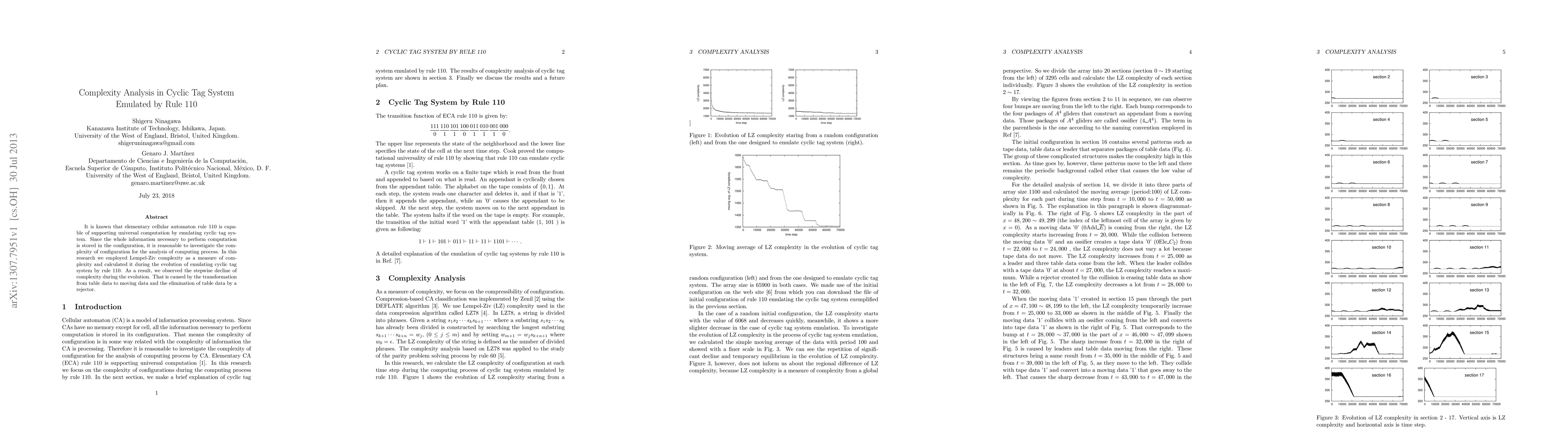 This research investigates the complexity of configurations in a cyclic tag system emulated by cellular automaton Rule 110 using Lempel-Ziv complexity. The study observes a stepwise decline in complexity during evolution, attributed to the transformation from table data to moving data and the elimination of table data by a rejector.