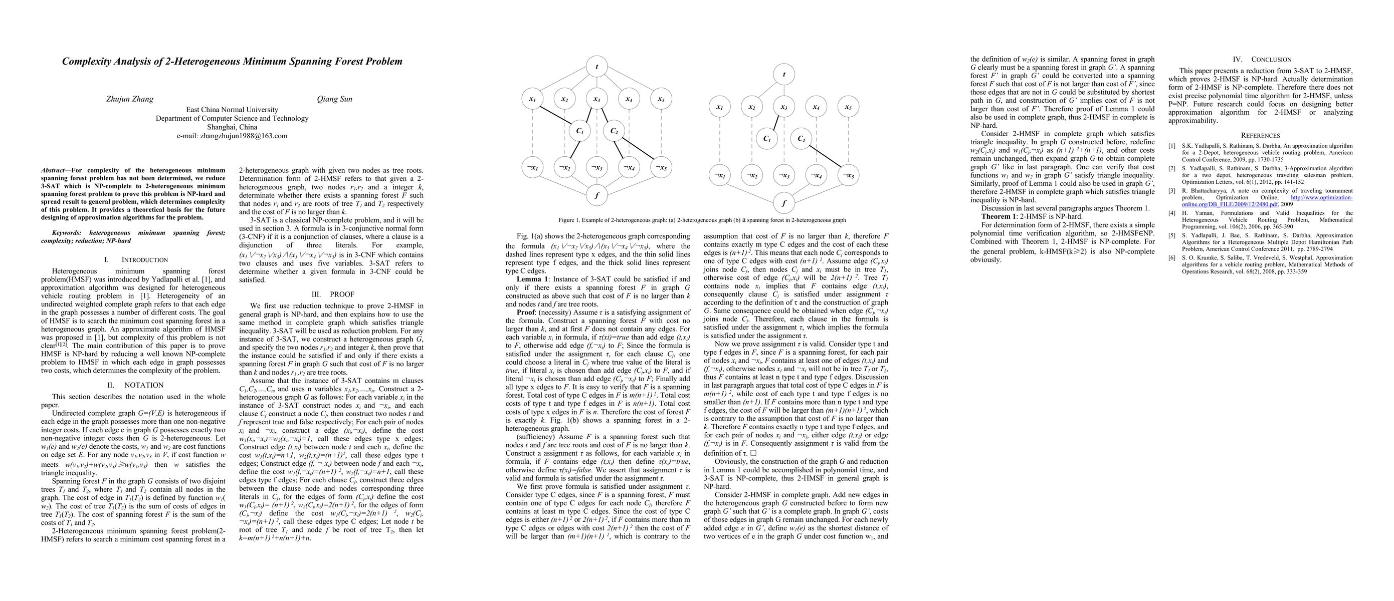 This paper proves the 2-heterogeneous minimum spanning forest problem is NP-hard by reducing the NP-complete 3-SAT problem to it, establishing its computational complexity. This theoretical foundation supports future development of approximation algorithms for the problem.