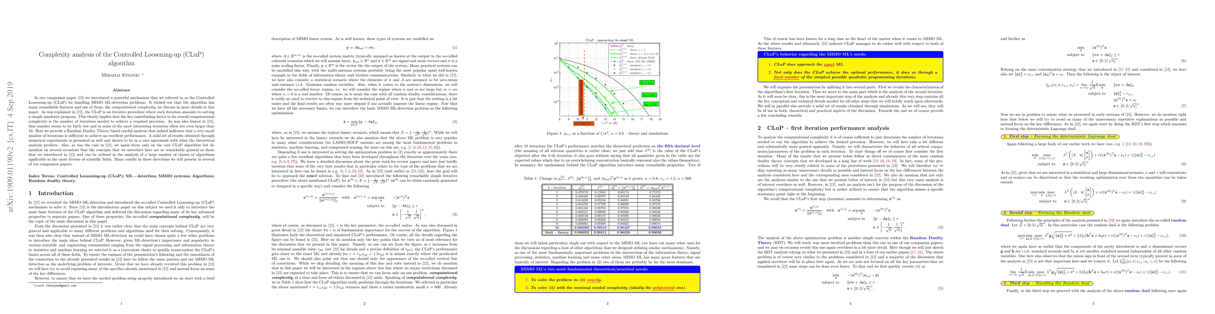 In our companion paper \cite{Stojnicclupint19} we introduced a powerful mechanism that we referred to as the Controlled Loosening-up (CLuP) for handling MIMO ML-detection problems. It turned out that the algorithm has many remarkable features and one of them, the \emph{computational complexity}, we discuss in more details in this paper. As was explained in \cite{Stojnicclupint19}, the CLuP is an iterative procedure where each iteration amounts to solving a simple quadratic program. This clearly implies that the key contributing factor to its overall computational complexity is the number of iterations needed to achieve a required precision. As was also hinted in \cite{Stojnicclupint19}, that number seems to be fairly low and in some of the most interesting scenarios often not even larger than $10$. Here we provide a Random Duality Theory based careful analysis that indeed indicates that a very small number of iterations is sufficient to achieve an excellent performance. A solid set of results obtained through numerical experiments is presented as well and shown to be in a nice agreement with what the theoretical analysis predicts. Also, as was the case in \cite{Stojnicclupint19}, we again focus only on the core CLuP algorithm but do mention on several occasions that the concepts that we introduce here are as remarkably general as those that we introduced in \cite{Stojnicclupint19} and can be utilized in the analysis of a large number of classes of algorithms applicable in the most diverse of scientific fields. Many results in these directions we will present in several of our companion papers.