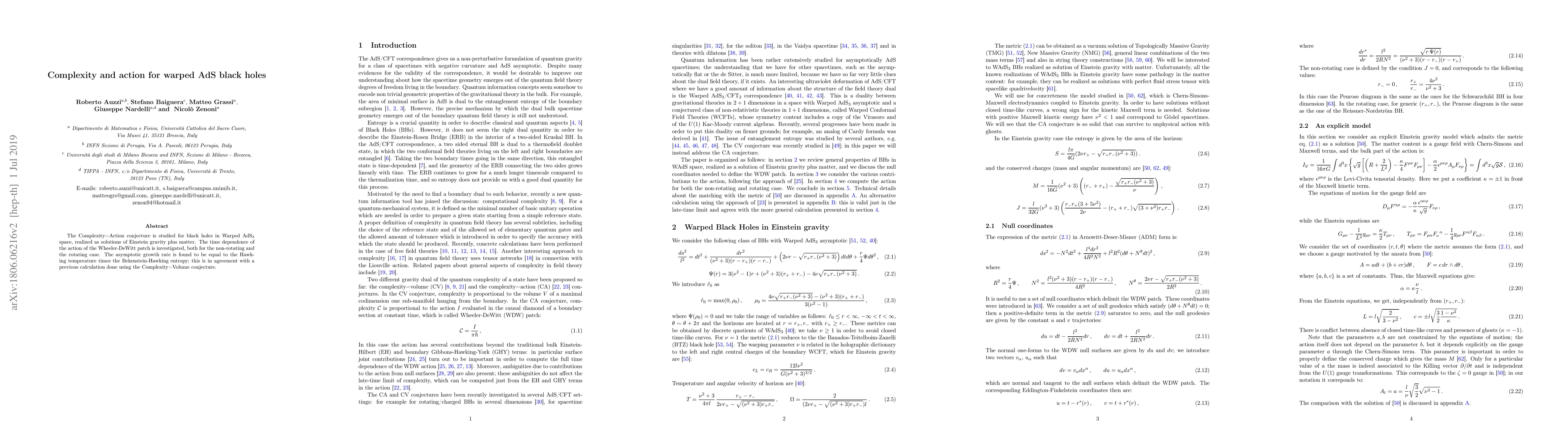 The paper presents detailed calculations of the action for warped AdS$_3$ black holes in Einstein gravity plus matter, confirming the CA conjecture's predictions and comparing them with the CV conjecture.