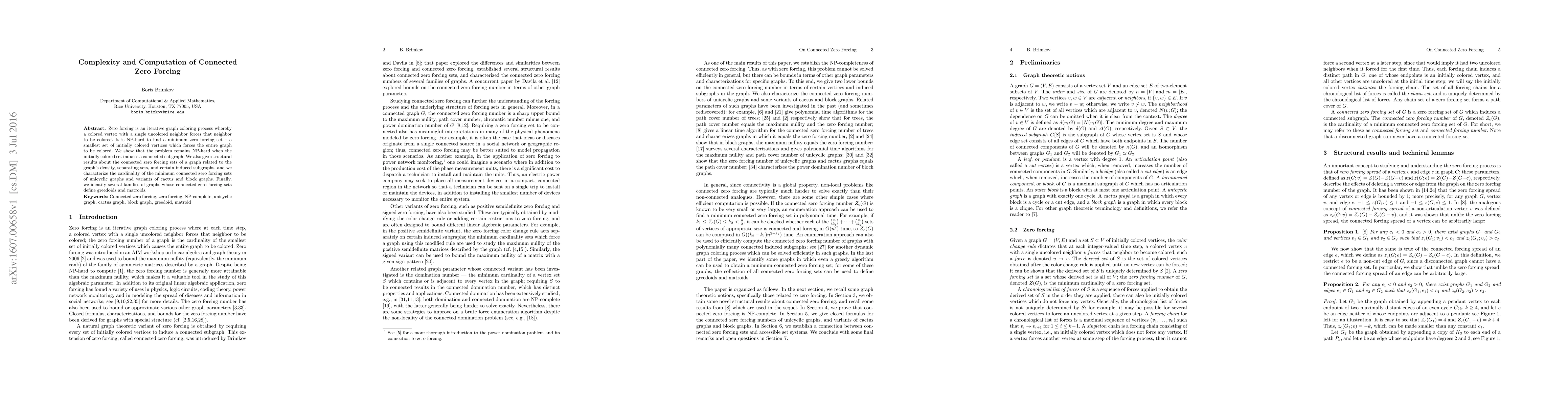 This paper investigates the complexity and computation of connected zero forcing sets in graphs, demonstrating that finding the minimum connected zero forcing set is NP-hard. It also provides structural insights and characterizes the minimum connected zero forcing sets for specific graph types, including unicyclic graphs and variants of cactus and block graphs, and identifies families of graphs where these sets form greedoids and matroids.