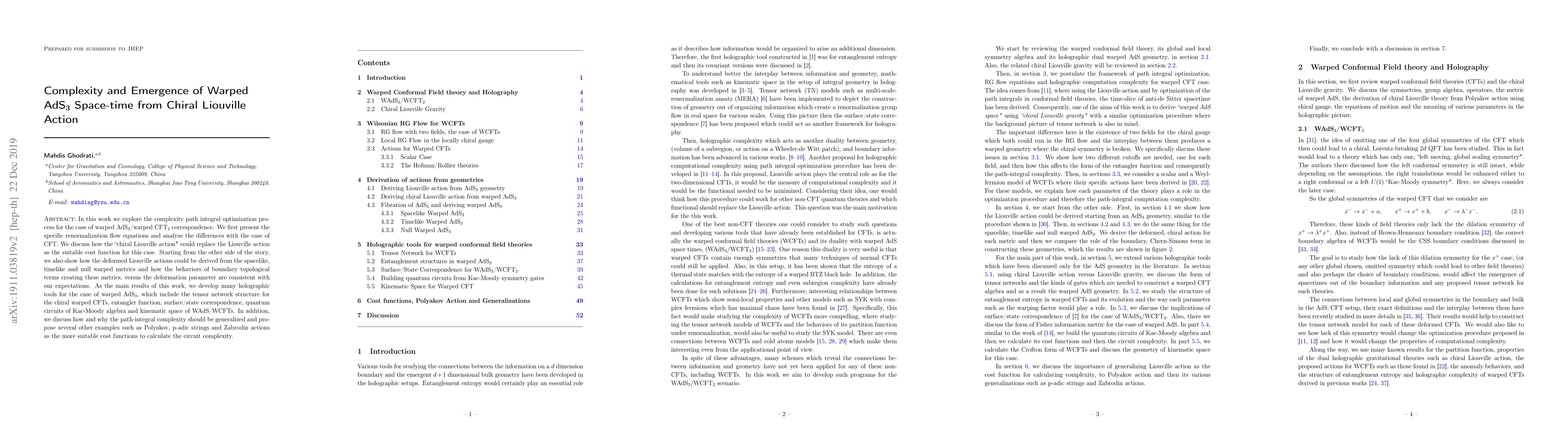 In this work we explore the complexity path integral optimization process for the case of warped $\text{AdS}_3$/warped $\text{CFT}_2$ correspondence. We first present the specific renormalization flow equations and analyze the differences with the case of CFT. We discuss how the "chiral Liouville action" could replace the Liouville action as the suitable cost function for this case. Starting from the other side of the story, we also show how the deformed Liouville actions could be derived from the spacelike, timelike and null warped metrics and how the behaviors of boundary topological terms creating these metrics, versus the deformation parameter are consistent with our expectations. As the main results of this work, we develop many holographic tools for the case of warped $\text{AdS}_3$, which include the tensor network structure for the chiral warped CFTs, entangler function, surface/state correspondence, quantum circuits of Kac-Moody algebra and kinematic space of WAdS/WCFTs. In addition, we discuss how and why the path-integral complexity should be generalized and propose several other examples such as Polyakov, p-adic strings and Zabrodin actions as the more suitable cost functions to calculate the circuit complexity.