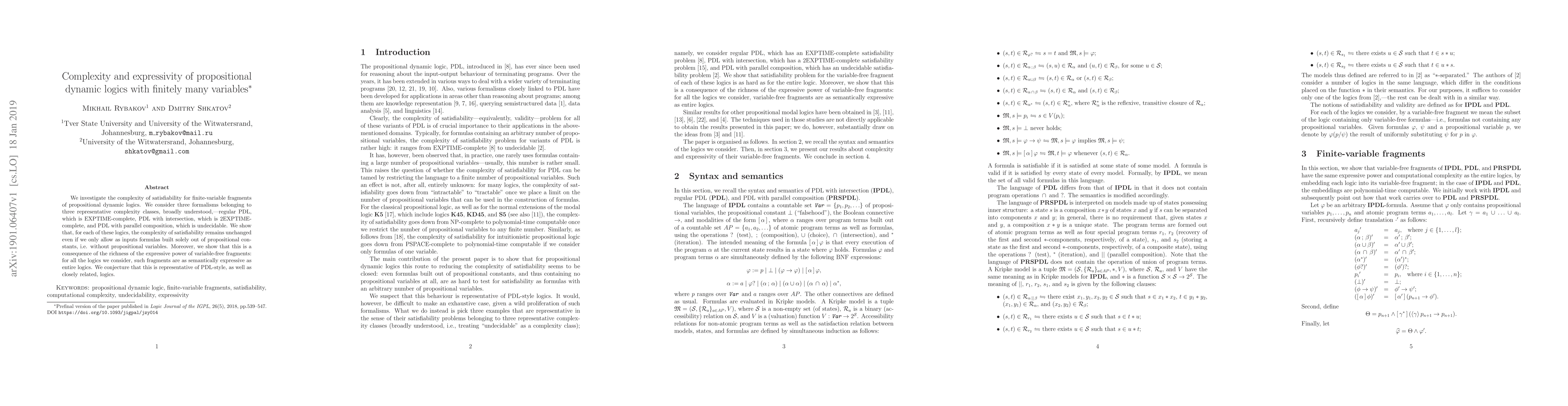 This paper explores the complexity of satisfiability in finite-variable fragments of three propositional dynamic logics: regular PDL, PDL with intersection, and PDL with parallel composition. It finds that the complexity remains the same even without propositional variables, due to the high expressive power of variable-free fragments, which match the expressiveness of the full logics.