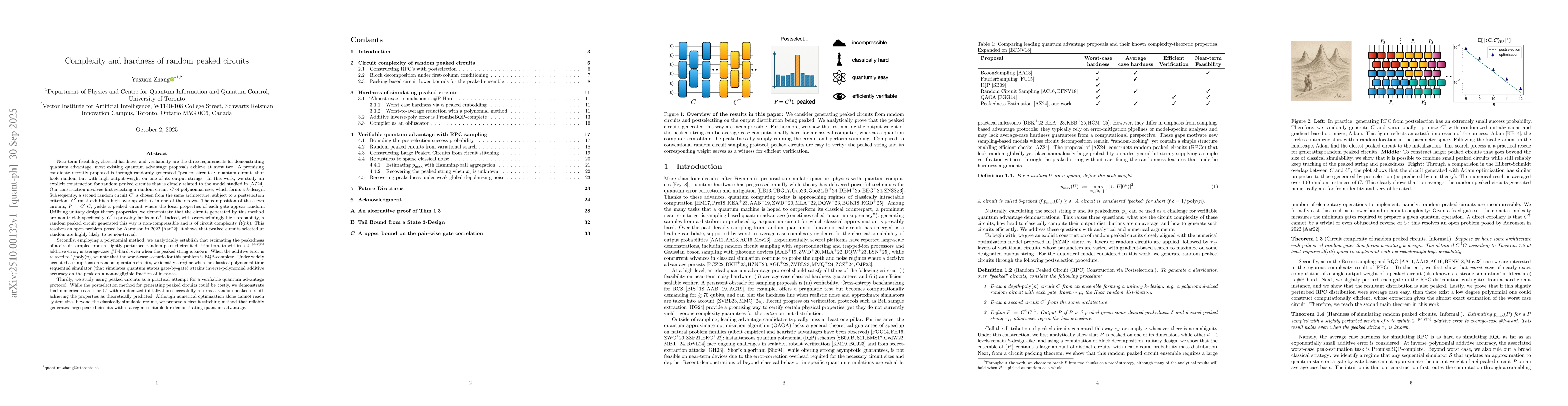The research employs a combination of analytical techniques and numerical simulations to study random peaked circuits. It leverages exact contraction methods and Adam optimization to analyze the properties of these circuits, while also exploring their potential for quantum advantage through classical hardness assumptions.