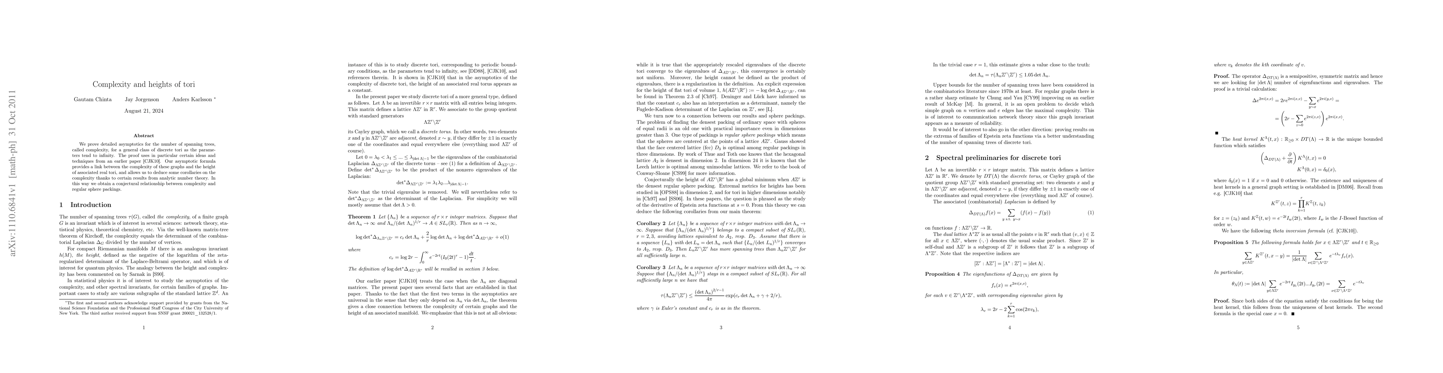 This paper establishes asymptotic formulas for the complexity of spanning trees in discrete tori, linking this complexity with the height of associated real tori. It leverages techniques from previous work and analytic number theory to propose a conjecture connecting complexity with regular sphere packings.