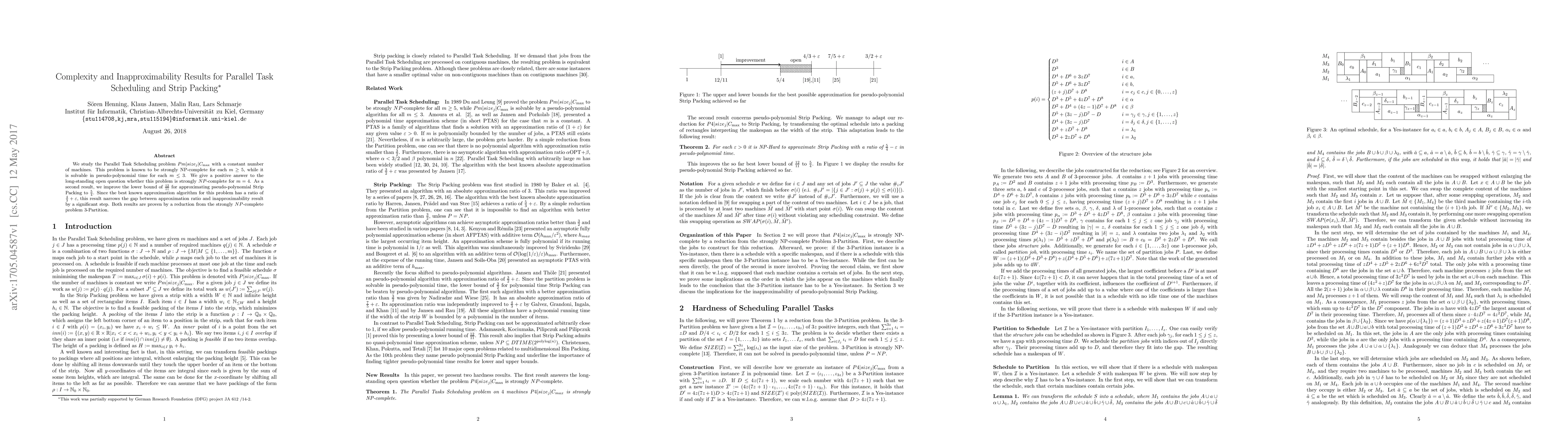 We study the Parallel Task Scheduling problem $Pm|size_j|C_{\max}$ with a constant number of machines. This problem is known to be strongly NP-complete for each $m \geq 5$, while it is solvable in pseudo-polynomial time for each $m \leq 3$. We give a positive answer to the long-standing open question whether this problem is strongly $NP$-complete for $m=4$. As a second result, we improve the lower bound of $\frac{12}{11}$ for approximating pseudo-polynomial Strip Packing to $\frac{5}{4}$. Since the best known approximation algorithm for this problem has a ratio of $\frac{4}{3} + \varepsilon$, this result narrows the gap between approximation ratio and inapproximability result by a significant step. Both results are proven by a reduction from the strongly $NP$-complete problem 3-Partition.