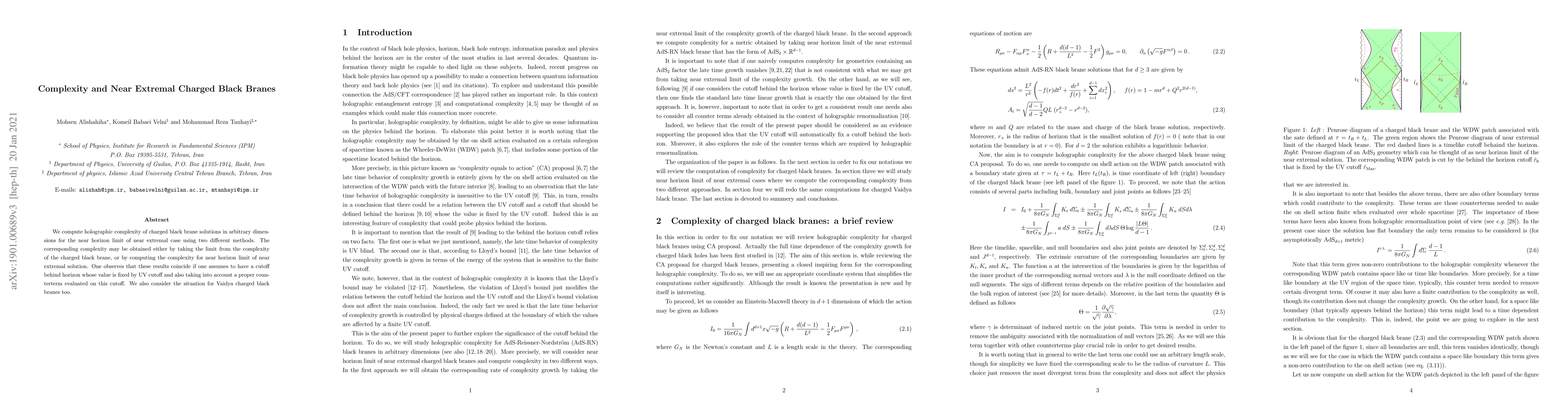 This paper investigates holographic complexity in near extremal charged black brane solutions in various dimensions, using two methods that yield coinciding results when a cutoff behind the horizon is applied, fixed by the UV cutoff and a proper counterterm. The study also extends to Vaidya charged black branes.