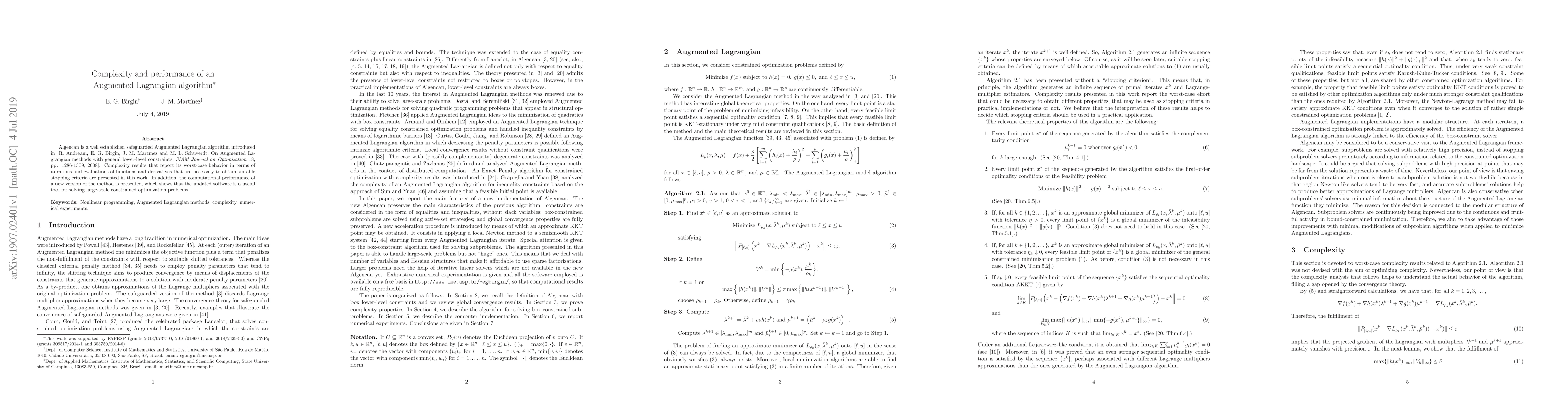 Algencan is a well established safeguarded Augmented Lagrangian algorithm introduced in [R. Andreani, E. G. Birgin, J. M. Mart\'{\i}nez and M. L. Schuverdt, On Augmented Lagrangian methods with general lower-level constraints, SIAM Journal on Optimization 18, pp. 1286-1309, 2008]. Complexity results that report its worst-case behavior in terms of iterations and evaluations of functions and derivatives that are necessary to obtain suitable stopping criteria are presented in this work. In addition, the computational performance of a new version of the method is presented, which shows that the updated software is a useful tool for solving large-scale constrained optimization problems.