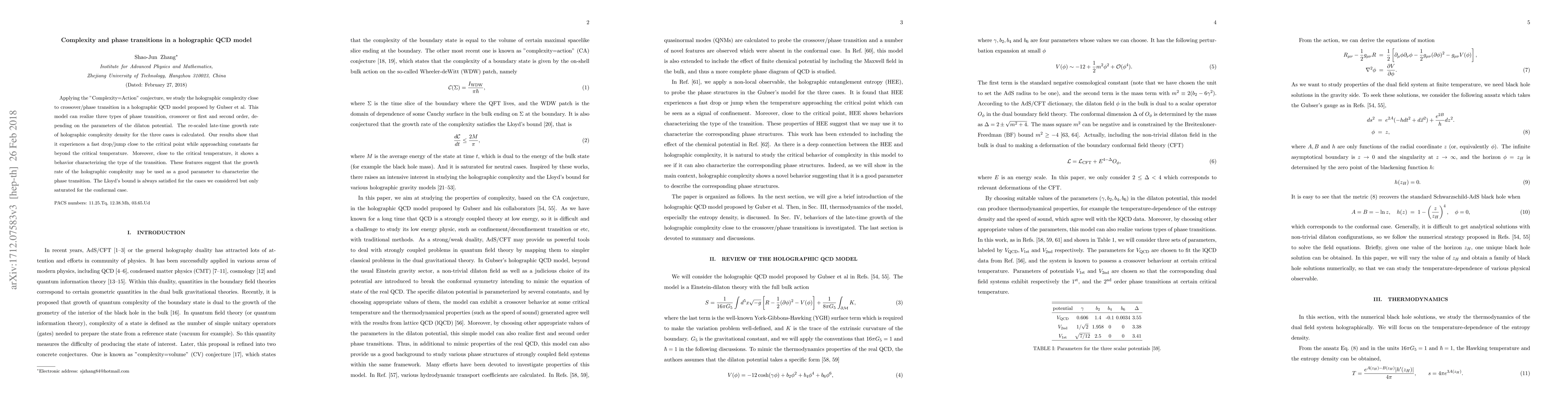 This paper investigates the holographic complexity near phase transitions in a holographic QCD model, finding that the complexity density exhibits a significant drop/jump near the critical point, with behavior indicative of the transition type. The study suggests that the growth rate of holographic complexity could serve as a parameter to characterize phase transitions.