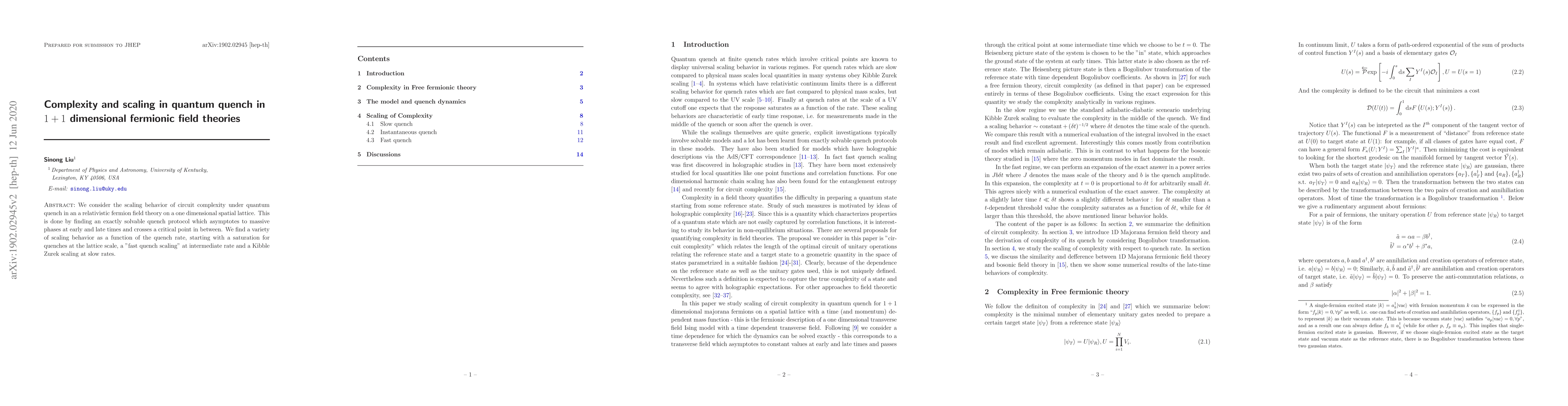This paper investigates the scaling behavior of circuit complexity during quantum quenches in a 1+1 dimensional relativistic fermionic field theory. It identifies distinct scaling regimes depending on the quench rate, including saturation, fast quench scaling, and Kibble-Zurek scaling.