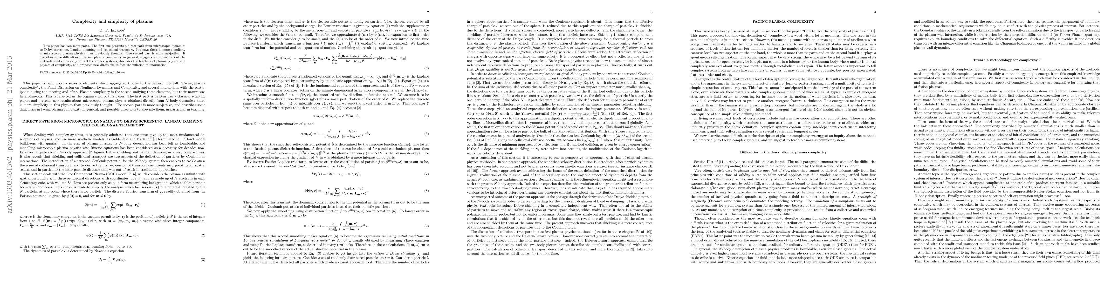 This paper has two main parts. The first one presents a direct path from microscopic dynamics to Debye screening, Landau damping and collisional transport. It shows there is more simplicity in microscopic plasma physics than previously thought. The second part is more subjective. It describes some difficulties in facing plasma complexity in general, suggests an inquiry about the methods used empirically to tackle complex systems, discusses the teaching of plasma physics as a physics of complexity, and proposes new directions to face the inflation of information.