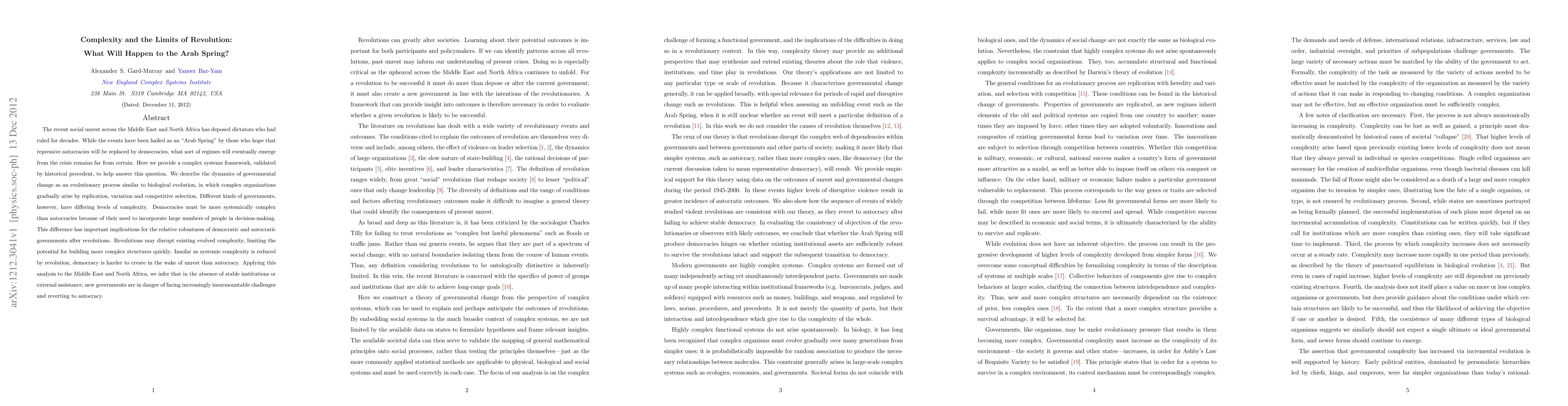 The recent social unrest across the Middle East and North Africa has deposed dictators who had ruled for decades. While the events have been hailed as an "Arab Spring" by those who hope that repressive autocracies will be replaced by democracies, what sort of regimes will eventually emerge from the crisis remains far from certain. Here we provide a complex systems framework, validated by historical precedent, to help answer this question. We describe the dynamics of governmental change as an evolutionary process similar to biological evolution, in which complex organizations gradually arise by replication, variation and competitive selection. Different kinds of governments, however, have differing levels of complexity. Democracies must be more systemically complex than autocracies because of their need to incorporate large numbers of people in decision-making. This difference has important implications for the relative robustness of democratic and autocratic governments after revolutions. Revolutions may disrupt existing evolved complexity, limiting the potential for building more complex structures quickly. Insofar as systemic complexity is reduced by revolution, democracy is harder to create in the wake of unrest than autocracy. Applying this analysis to the Middle East and North Africa, we infer that in the absence of stable institutions or external assistance, new governments are in danger of facing increasingly insurmountable challenges and reverting to autocracy.