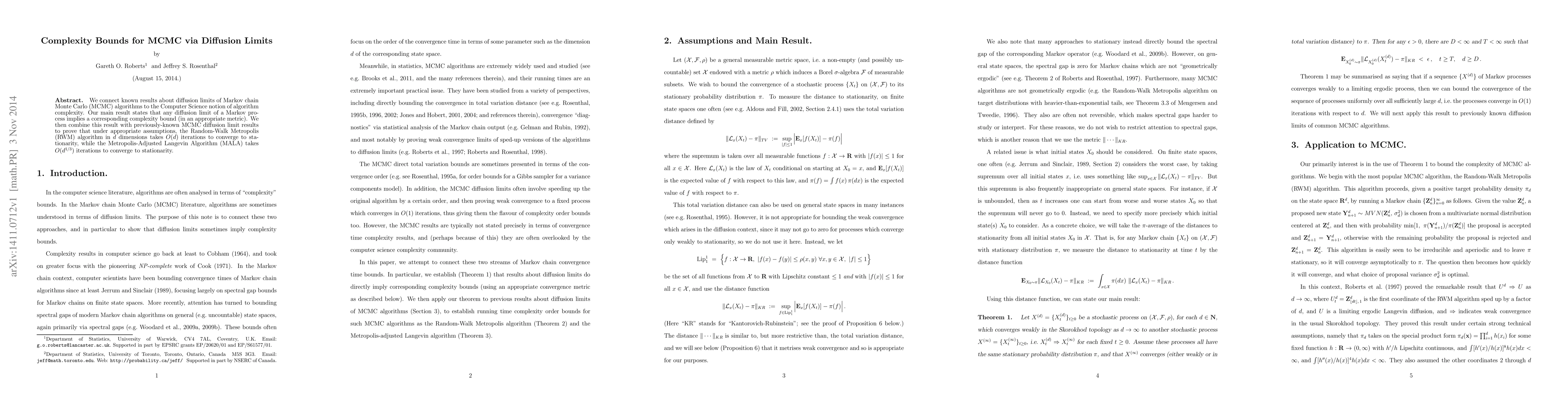 Research connects Markov chain Monte Carlo algorithms to complexity theory via diffusion limits, showing that certain MCMC algorithms have specific convergence times in terms of the dimensionality of the space they operate on.