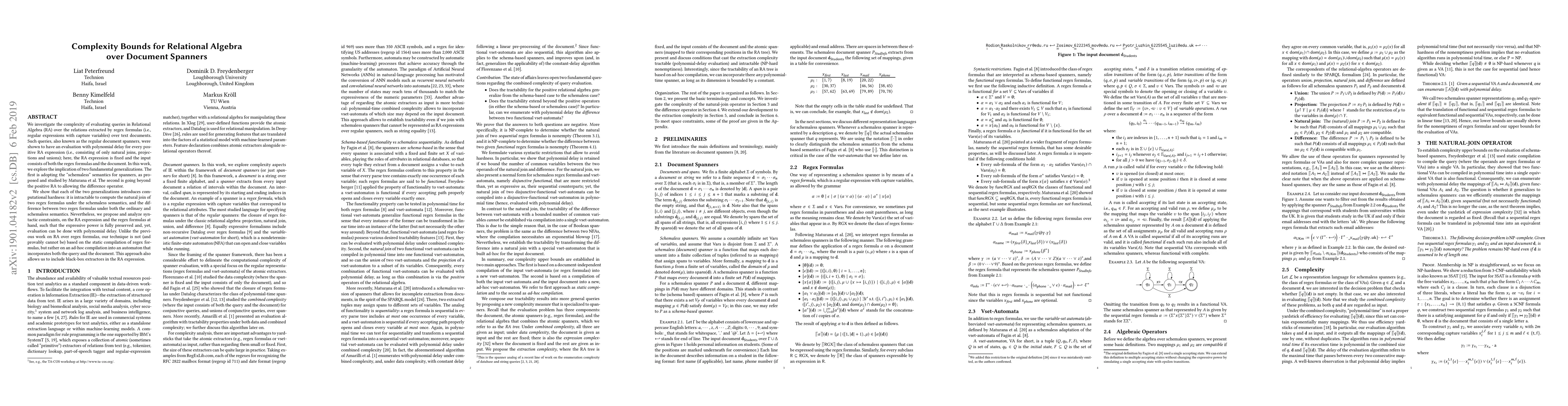 This paper explores the complexity of evaluating relational algebra queries over document spanners extracted by regex formulas, showing that two generalizations—schemaless semantics and allowing the difference operator—introduce computational hardness. The authors propose syntactic constraints to maintain expressive power while allowing evaluation with polynomial delay, using an ad-hoc automaton compilation approach instead of static regex compilation.