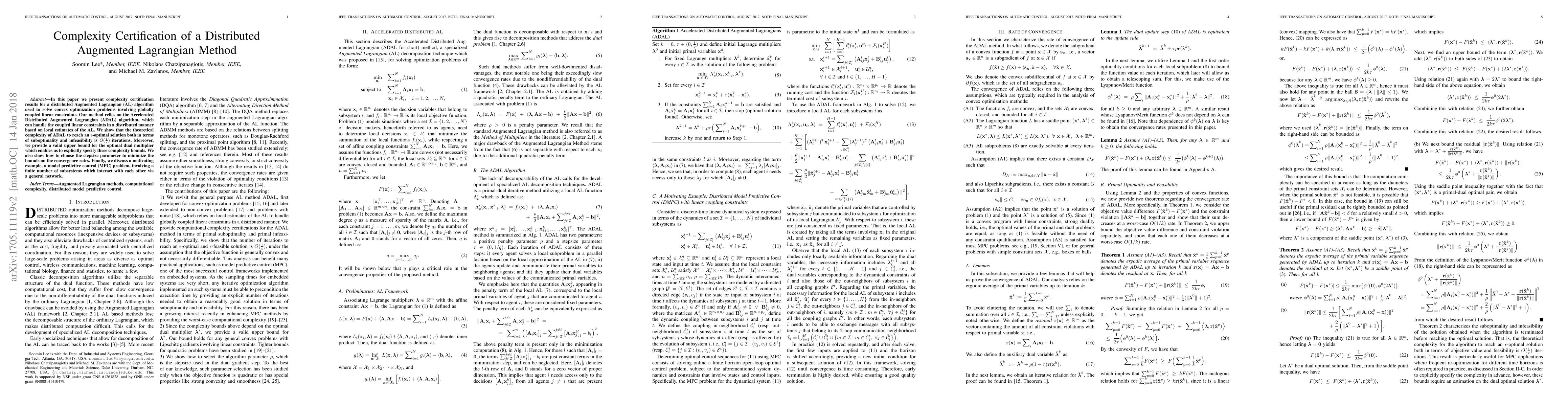 In this paper we present complexity certification results for a distributed Augmented Lagrangian (AL) algorithm used to solve convex optimization problems involving globally coupled linear constraints. Our method relies on the Accelerated Distributed Augmented Lagrangian (ADAL) algorithm, which can handle the coupled linear constraints in a distributed manner based on local estimates of the AL. We show that the theoretical complexity of ADAL to reach an $\epsilon$-optimal solution both in terms of suboptimality and infeasibility is $O(\frac{1}{\epsilon})$ iterations. Moreover, we provide a valid upper bound for the optimal dual multiplier which enables us to explicitly specify these complexity bounds. We also show how to choose the stepsize parameter to minimize the bounds on the convergence rates. Finally, we discuss a motivating example, a model predictive control (MPC) problem, involving a finite number of subsystems which interact with each other via a general network.
