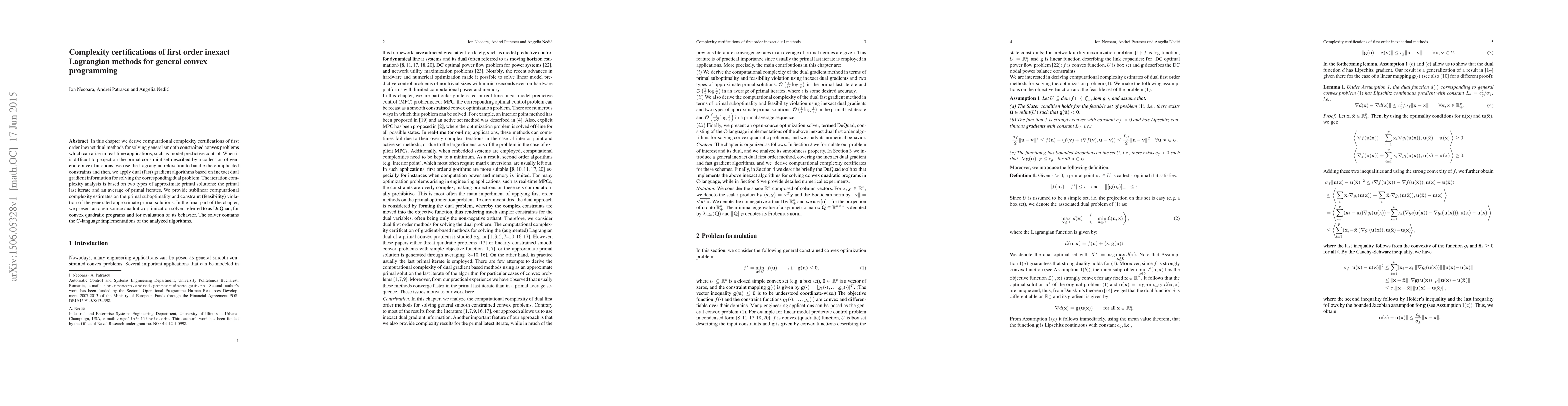 In this chapter we derive computational complexity certifications of first order inexact dual methods for solving general smooth constrained convex problems which can arise in real-time applications, such as model predictive control. When it is difficult to project on the primal constraint set described by a collection of general convex functions, we use the Lagrangian relaxation to handle the complicated constraints and then, we apply dual (fast) gradient algorithms based on inexact dual gradient information for solving the corresponding dual problem. The iteration complexity analysis is based on two types of approximate primal solutions: the primal last iterate and an average of primal iterates. We provide sublinear computational complexity estimates on the primal suboptimality and constraint (feasibility) violation of the generated approximate primal solutions. In the final part of the chapter, we present an open-source quadratic optimization solver, referred to as DuQuad, for convex quadratic programs and for evaluation of its behaviour. The solver contains the C-language implementations of the analyzed algorithms.