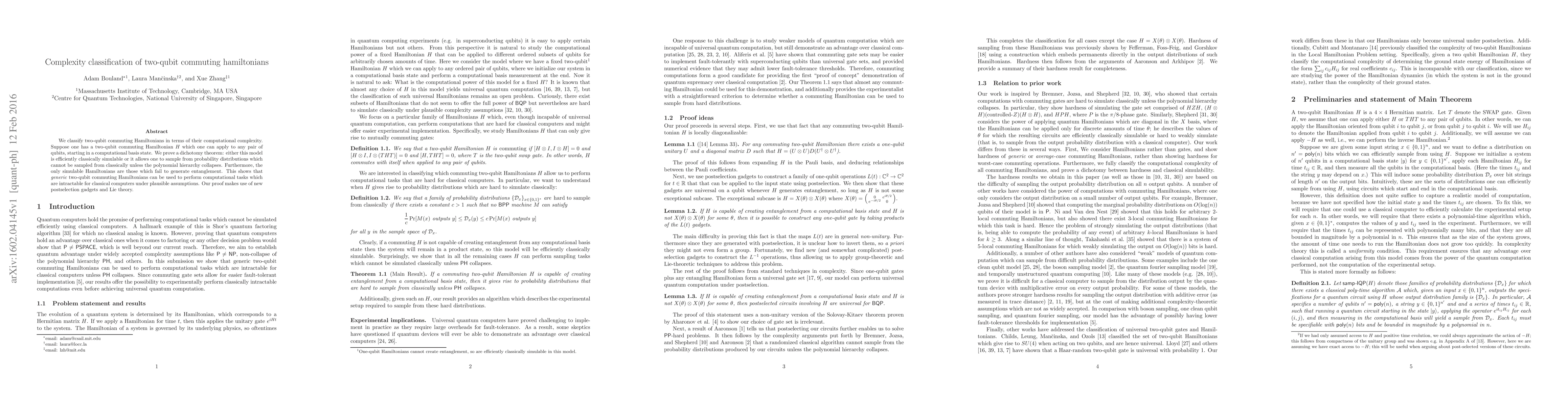 This paper classifies two-qubit commuting Hamiltonians based on their computational complexity, proving that they either allow efficient classical simulation or enable sampling from distributions intractable classically unless the polynomial hierarchy collapses. The only simulable Hamiltonians are those that do not generate entanglement.