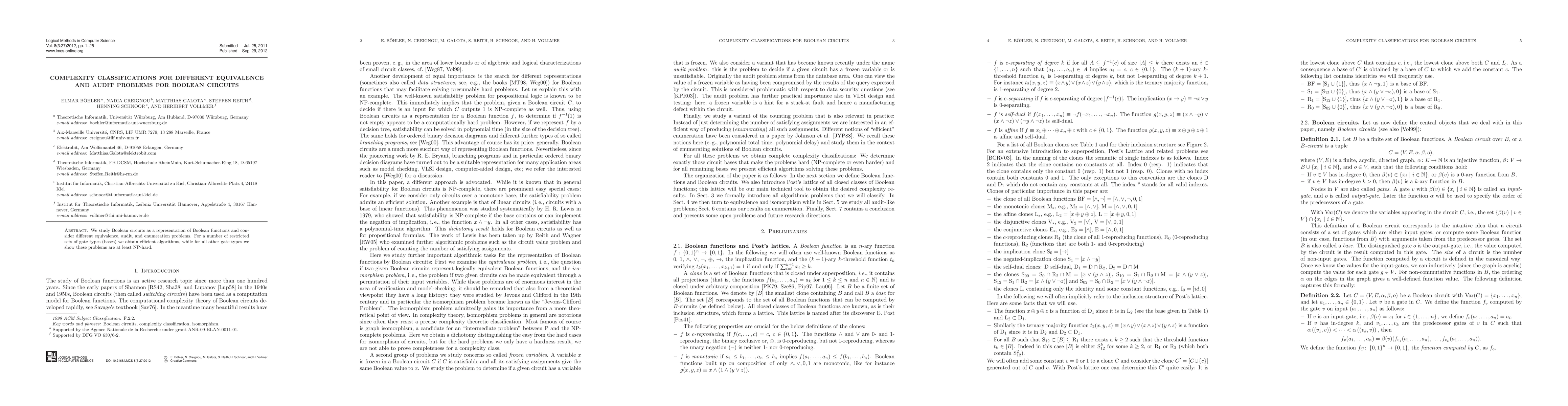 We study Boolean circuits as a representation of Boolean functions and consider different equivalence, audit, and enumeration problems. For a number of restricted sets of gate types (bases) we obtain efficient algorithms, while for all other gate types we show these problems are at least NP-hard.
