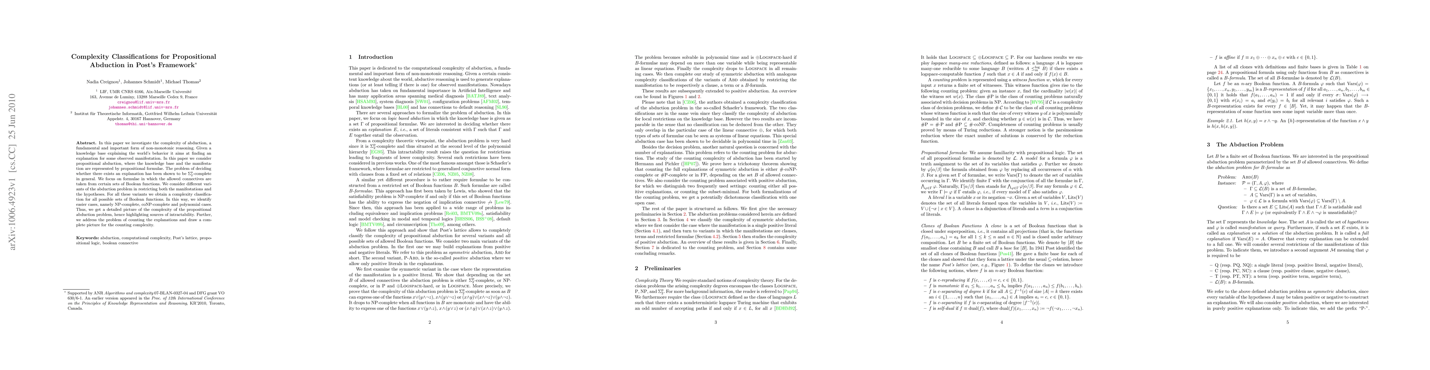 This paper explores the complexity classifications of propositional abduction within Post's framework, focusing on various sets of Boolean functions. It identifies different complexity levels, including NP-complete, coNP-complete, and polynomial cases, providing a detailed complexity analysis and highlighting sources of intractability.