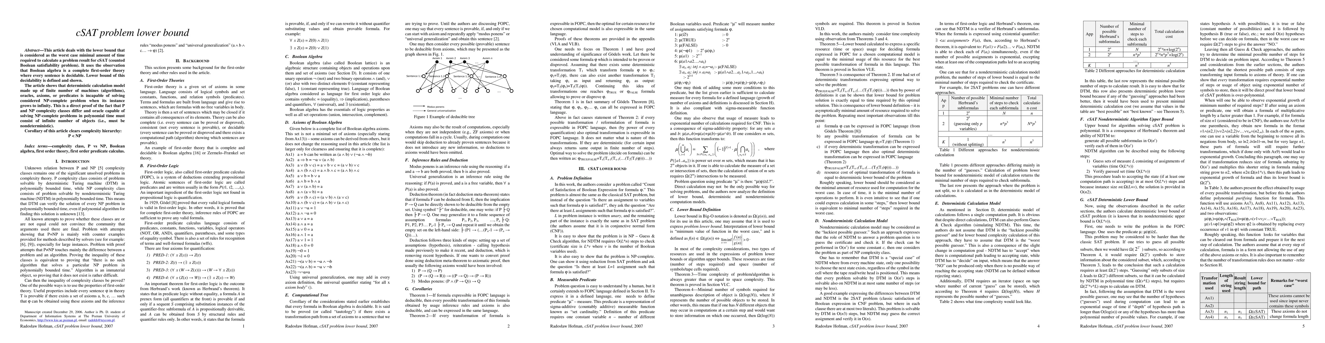 This article discusses completeness of Boolean Algebra as First Order Theory in Goedel's meaning. If Theory is complete then any possible transformation is equivalent to some transformation using axioms, predicates etc. defined for this theory. If formula is to be proved (or disproved) then it has to be reduced to axioms. If every transformation is deducible then also optimal transformation is deducible. If every transformation is exponential then optimal one is too, what allows to define lower bound for discussed problem to be exponential (outside P). Then we show algorithm for NDTM solving the same problem in O(n^c) (so problem is in NP), what proves that P \neq NP. Article proves also that result of relativisation of P=NP question and oracle shown by Baker-Gill-Solovay distinguish between deterministic and non-deterministic calculation models. If there exists oracle A for which P^A=NP^A then A consists of infinite number of algorithms, DTMs, axioms and predicates, or like NDTM infinite number of simultaneous states.