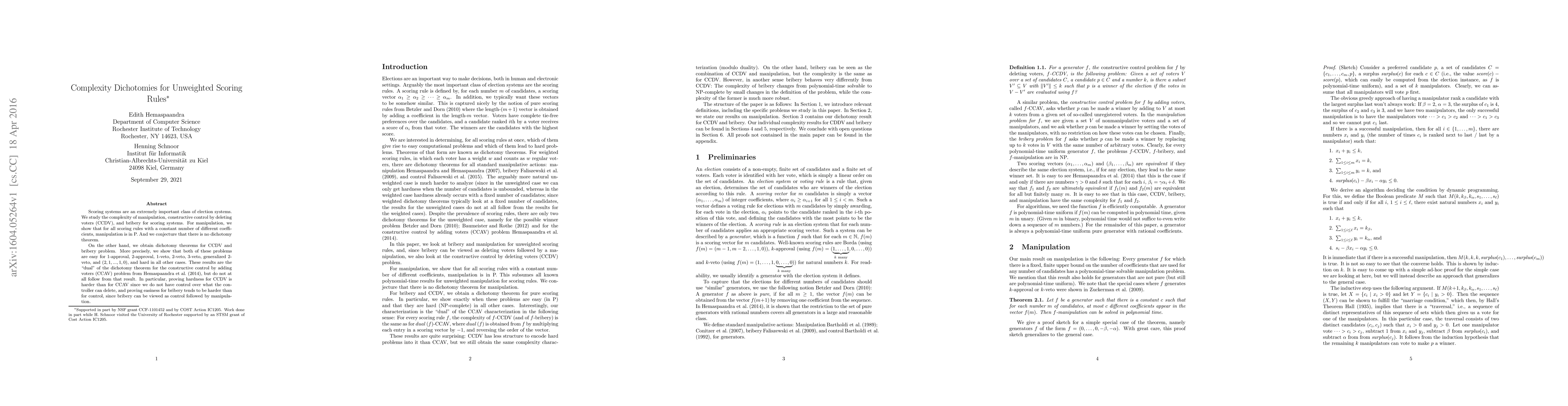 This paper investigates the complexity of manipulation, constructive control by deleting voters (CCDV), and bribery in unweighted scoring rules. It finds manipulation to be tractable for scoring rules with a constant number of coefficients, while CCDV and bribery exhibit a dichotomy: they are easy for specific rules but hard for all others.