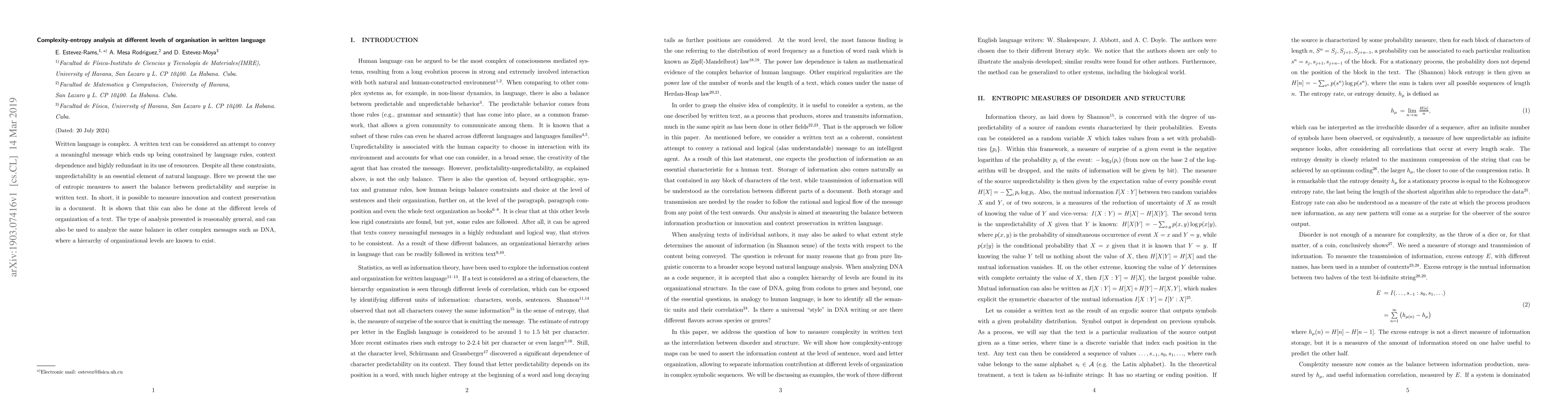Researchers used entropic measures to analyze the balance between predictability and surprise in written text at different levels of organization. They found that innovation and context preservation can be measured in documents.