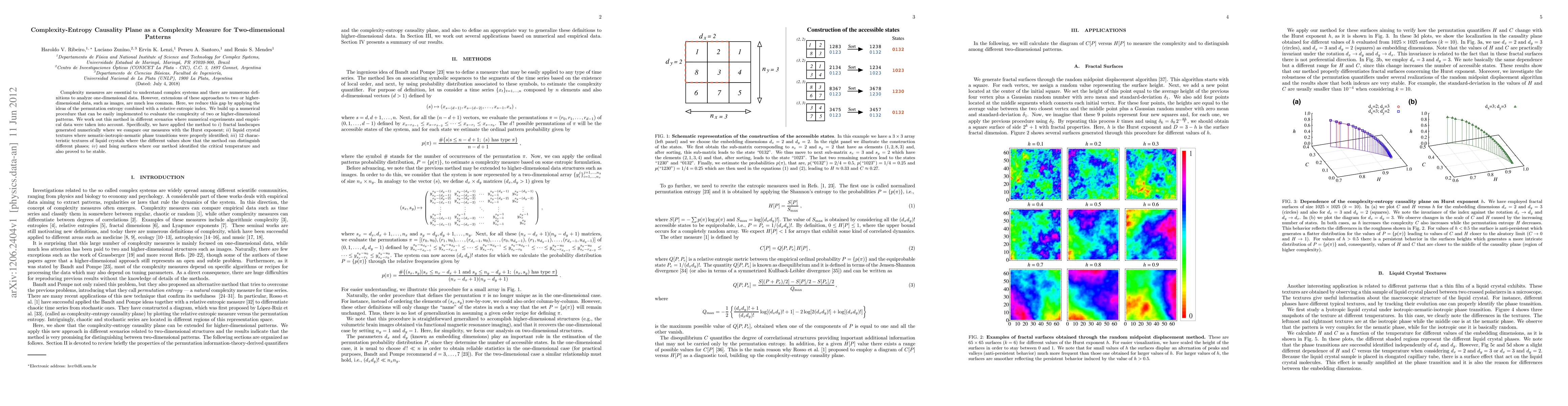 This paper introduces a new complexity measure for two-dimensional patterns using the Complexity-Entropy Causality Plane, combining permutation entropy and a relative entropic index. The method is tested on fractal landscapes, liquid crystal textures, and Ising surfaces, demonstrating its ability to identify phase transitions and distinguish different phases.