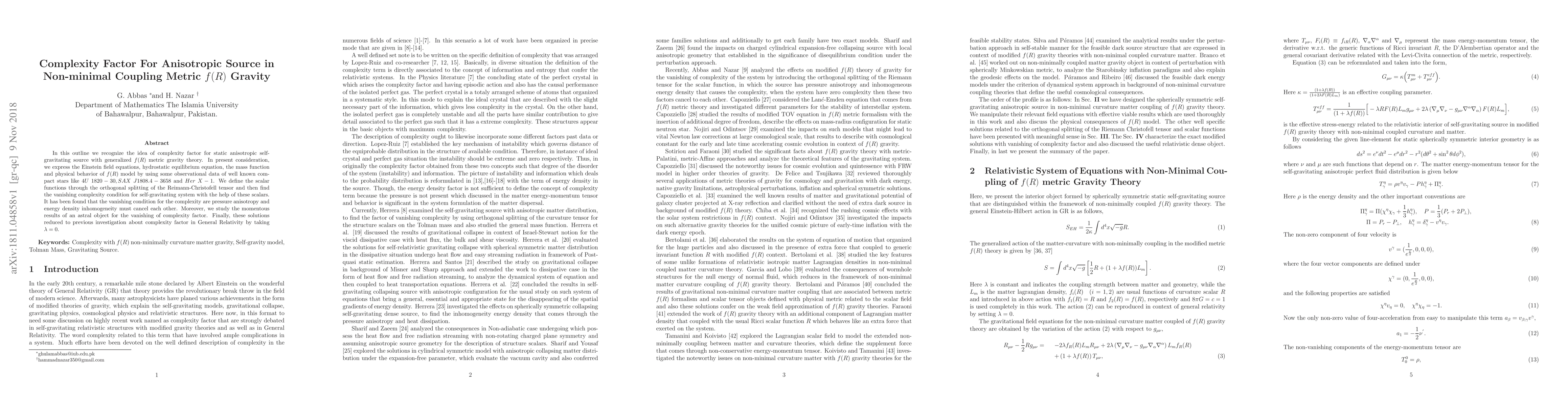 In this outline we recognize the idea of complexity factor for static anisotropic self-gravitating source with generalized $f(R)$ metric gravity theory. In present consideration, we express the Einstein field equations, hydrostatic equilibrium equation, the mass function and physical behavior of $f(R)$ model by using some observational data of well known compact stars like $4U~1820-30, SAX~J1808.4-3658$ and $Her~X-1$. We define the scalar functions through the orthogonal splitting of the Reimann-Christofell tensor and then find the vanishing complexity condition for self-gravitating system with the help of these scalars. It has been found that the vanishing condition for the complexity are pressure anisotropy and energy density inhomogeneity must cancel each other. Moreover, we study the momentous results of an astral object for the vanishing of complexity factor. Finally, these solutions reduced to previous investigation about complexity factor in General Relativity by taking $\lambda=0$.