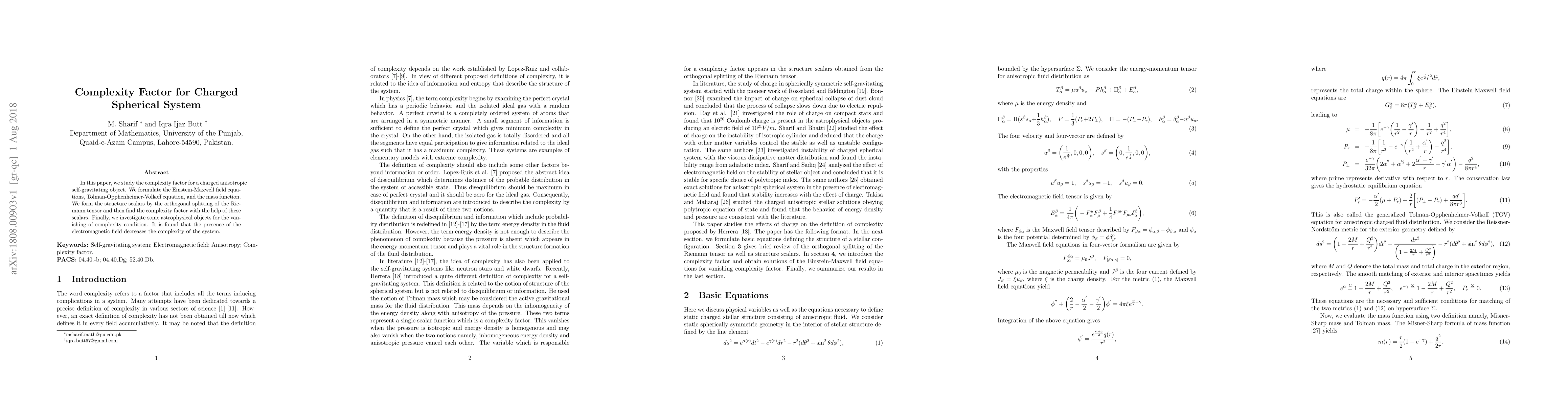Researchers investigate the complexity of charged spherical systems, finding that electromagnetic fields decrease system complexity.