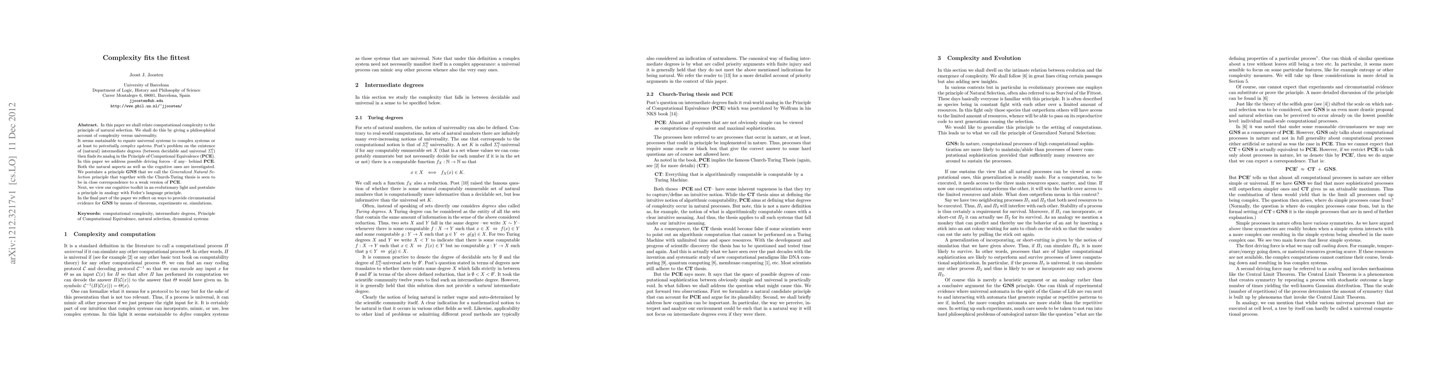 In this paper we shall relate computational complexity to the principle of natural selection. We shall do this by giving a philosophical account of complexity versus universality. It seems sustainable to equate universal systems to complex systems or at least to potentially complex systems. Post's problem on the existence of (natural) intermediate degrees (between decidable and universal RE) then finds its analog in the Principle of Computional Equivalence (PCE). In this paper we address possible driving forces --if any-- behind PCE. Both the natural aspects as well as the cognitive ones are investigated. We postulate a principle GNS that we call the Generalized Natural Selection principle that together with the Church-Turing thesis is seen to be in close correspondence to a weak version of PCE. Next, we view our cognitive toolkit in an evolutionary light and postulate a principle in analogy with Fodor's language principle. In the final part of the paper we reflect on ways to provide circumstantial evidence for GNS by means of theorems, experiments or, simulations.
