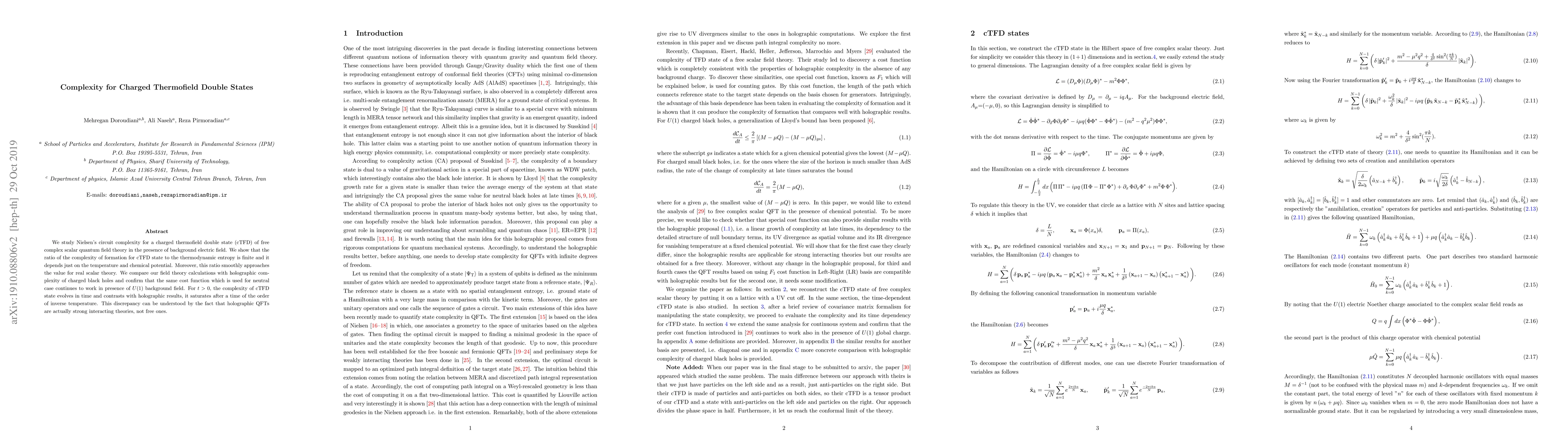 We study Nielsen's circuit complexity for a charged thermofield double state (cTFD) of free complex scalar quantum field theory in the presence of background electric field. We show that the ratio of the complexity of formation for cTFD state to the thermodynamic entropy is finite and it depends just on the temperature and chemical potential. Moreover, this ratio smoothly approaches the value for real scalar theory. We compare our field theory calculations with holographic complexity of charged black holes and confirm that the same cost function which is used for neutral case continues to work in presence of $U(1)$ background field. For $t>0$, the complexity of cTFD state evolves in time and contrasts with holographic results, it saturates after a time of the order of inverse temperature. This discrepancy can be understood by the fact that holographic QFTs are actually strong interacting theories, not free ones.