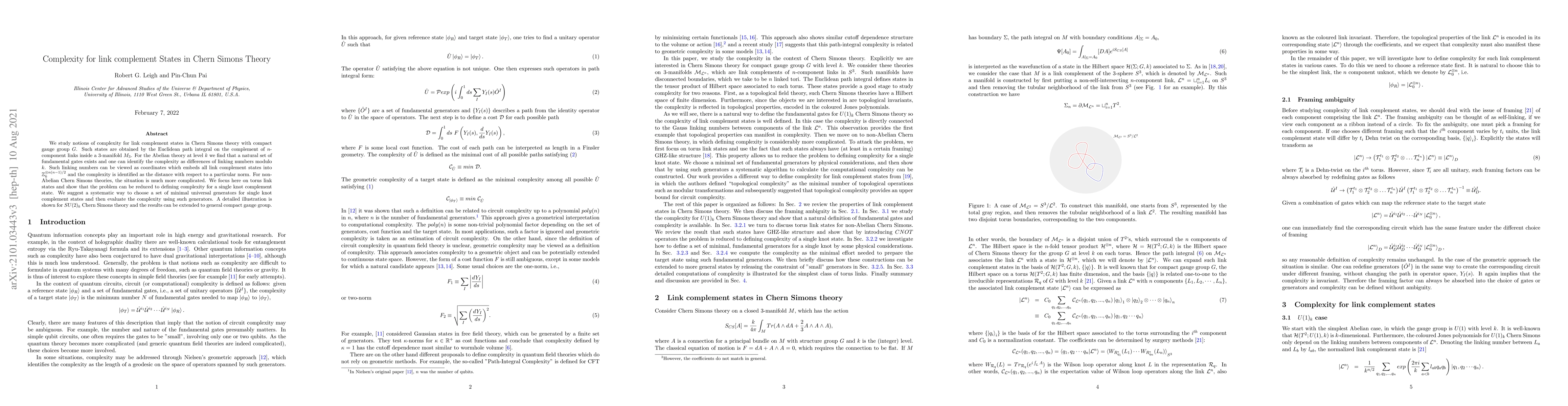 We study notions of complexity for link complement states in Chern Simons theory with compact gauge group $G$. Such states are obtained by the Euclidean path integral on the complement of $n$-component links inside a 3-manifold $M_3$. For the Abelian theory at level $k$ we find that a natural set of fundamental gates exists and one can identify the complexity as differences of linking numbers modulo $k$. Such linking numbers can be viewed as coordinates which embeds all link complement states into $\mathbb{Z}_k ^{\otimes n(n-1)/2}$ and the complexity is identified as the distance with respect to a particular norm. For non-Abelian Chern Simons theories, the situation is much more complicated. We focus here on torus link states and show that the problem can be reduced to defining complexity for a single knot complement state. We suggest a systematic way to choose a set of minimal universal generators for single knot complement states and then evaluate the complexity using such generators. A detailed illustration is shown for $SU(2)_k$ Chern Simons theory and the results can be extended to general compact gauge group.