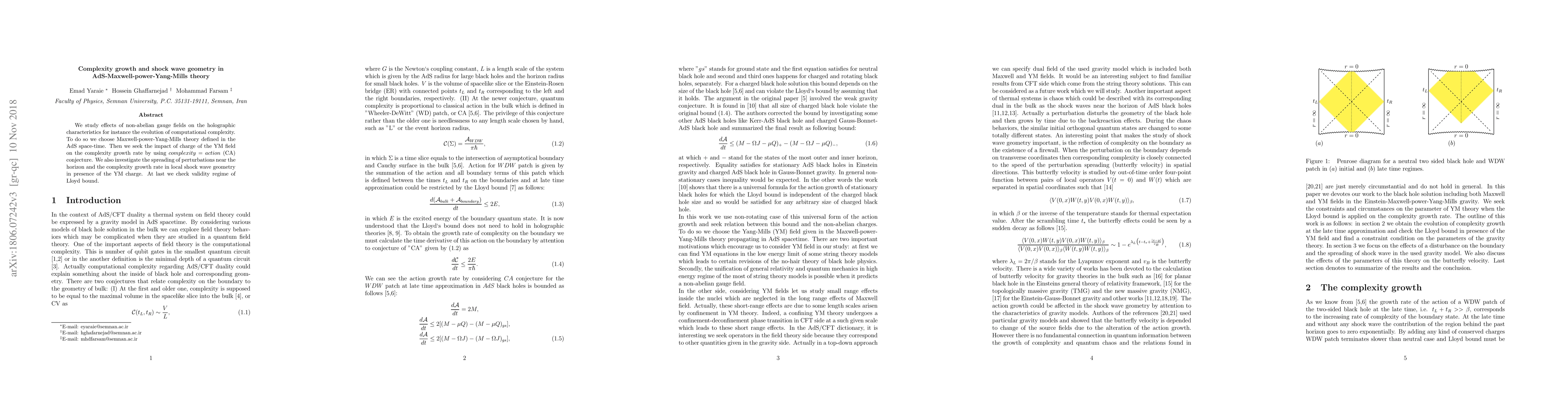 We study effects of non-abelian gauge fields on the holographic characteristics for instance the evolution of computational complexity. To do so we choose Maxwell-power-Yang-Mills theory defined in the AdS space-time. Then we seek the impact of charge of the YM field on the complexity growth rate by using $complexity=action$ (CA) conjecture. We also investigate the spreading of perturbations near the horizon and the complexity growth rate in local shock wave geometry in presence of the YM charge. At last we check validity regime of Lloyd bound.