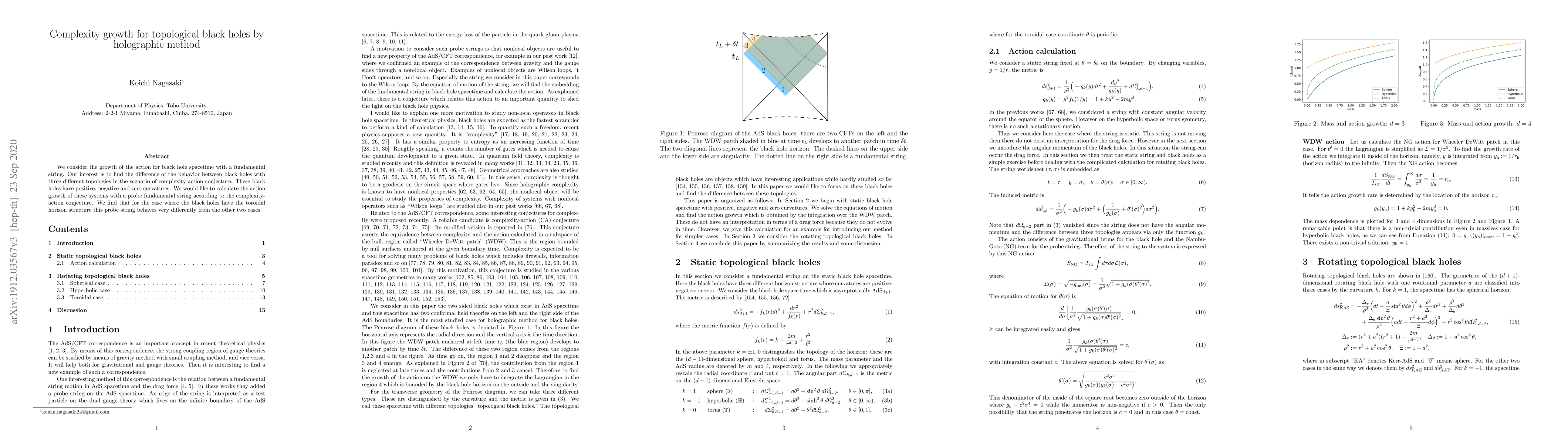We consider the growth of the action for black hole spacetime with a fundamental string. Our interest is to find the difference of the behavior between black holes with three different topologies in the scenario of complexity-action conjecture. These black holes have positive, negative and zero curvatures. We would like to calculate the action growth of these systems with a probe fundamental string according to the complexity-action conjecture. We find that for the case where the black holes have the toroidal horizon structure this probe string behaves very differently from the other two cases.