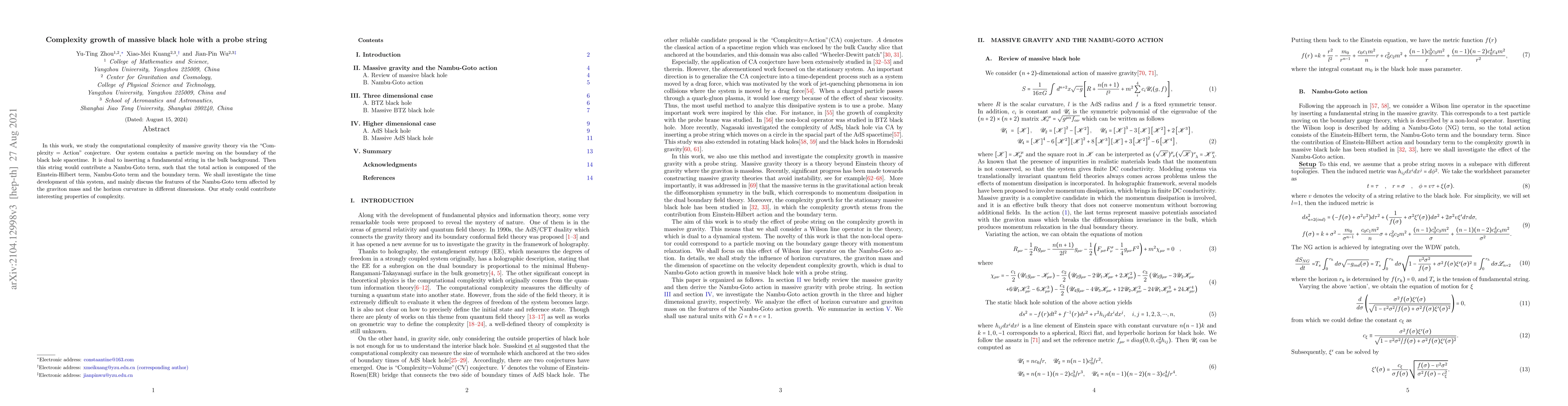 In this work, we study the computational complexity of massive gravity theory via the "Complexity = Action" conjecture. Our system contains a particle moving on the boundary of the black hole spacetime. It is dual to inserting a fundamental string in the bulk background. Then this string would contribute a Nambu-Goto term, such that the total action is composed of the Einstein-Hilbert term, Nambu-Goto term and the boundary term. We shall investigate the time development of this system, and mainly discuss the features of the Nambu-Goto term affected by the graviton mass and the horizon curvature in different dimensions. Our study could contribute interesting properties of complexity.