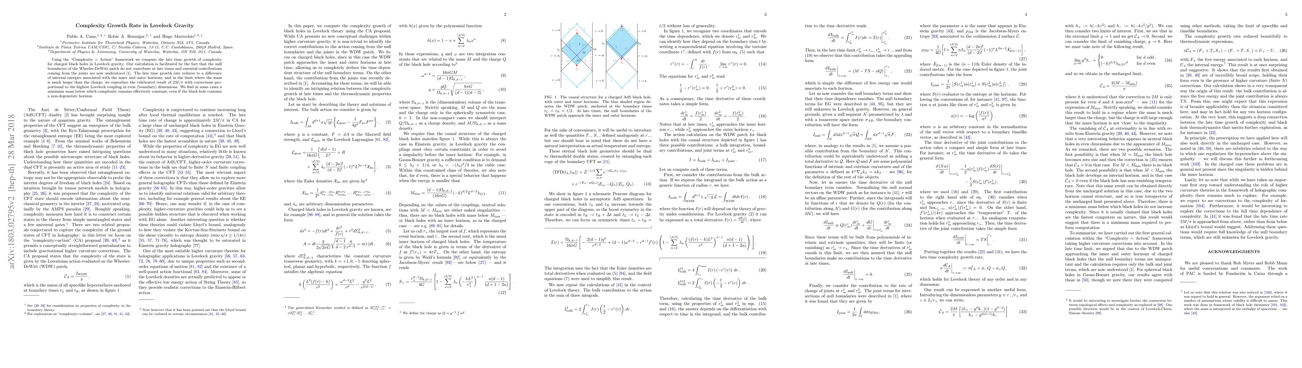Using the "Complexity = Action" framework we compute the late time growth of complexity for charged black holes in Lovelock gravity. Our calculation is facilitated by the fact that the null boundaries of the Wheeler-DeWitt patch do not contribute at late times and essential contributions coming from the joints are now understood arXiv:1803.00172. The late time growth rate reduces to a difference of internal energies associated with the inner and outer horizons, and in the limit where the mass is much larger than the charge, we reproduce the celebrated result of $2M/\pi$ with corrections proportional to the highest Lovelock coupling in even (boundary) dimensions. We find in some cases a minimum mass below which complexity remains effectively constant, even if the black hole contains a non-degenerate horizon.