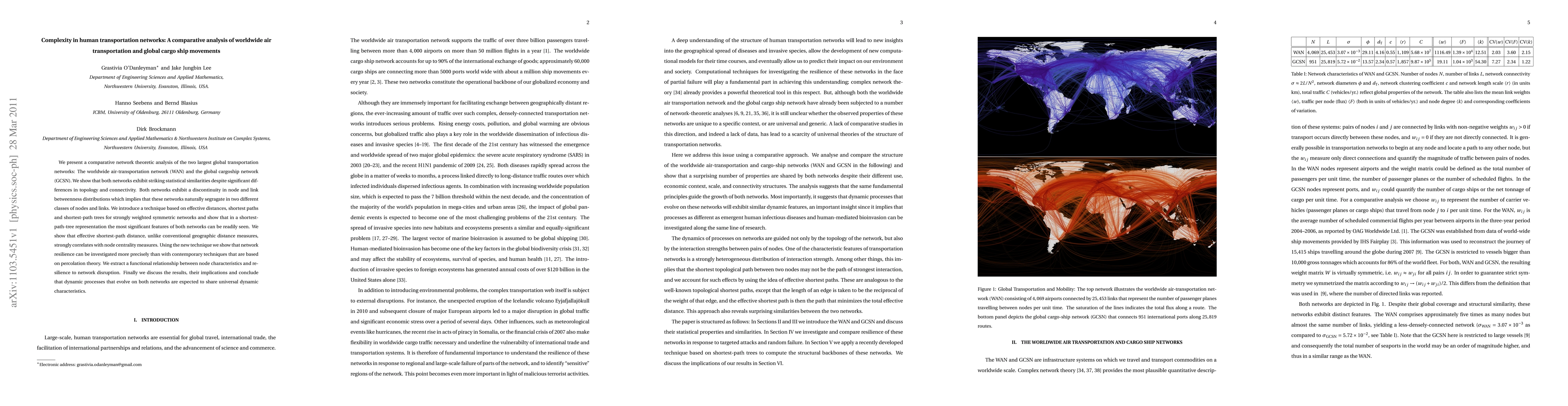This paper conducts a comparative network analysis of worldwide air-transportation and global cargo ship networks, revealing statistical similarities despite topological differences. It introduces a new technique to better understand network resilience and finds that effective shortest-path distance correlates strongly with node centrality, suggesting universal dynamic characteristics in both networks.