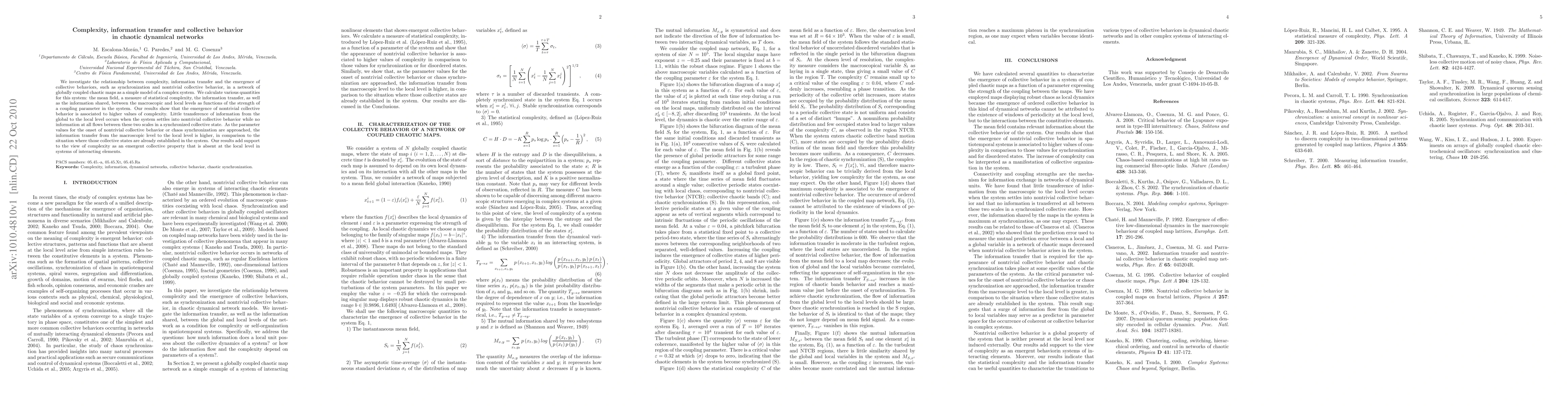 This paper explores the interplay between complexity, information transfer, and collective behaviors in chaotic dynamical networks, finding that higher complexity correlates with the emergence of nontrivial collective behavior. It reveals that information transfer diminishes as the system enters nontrivial collective states, supporting the view of complexity as an emergent property.