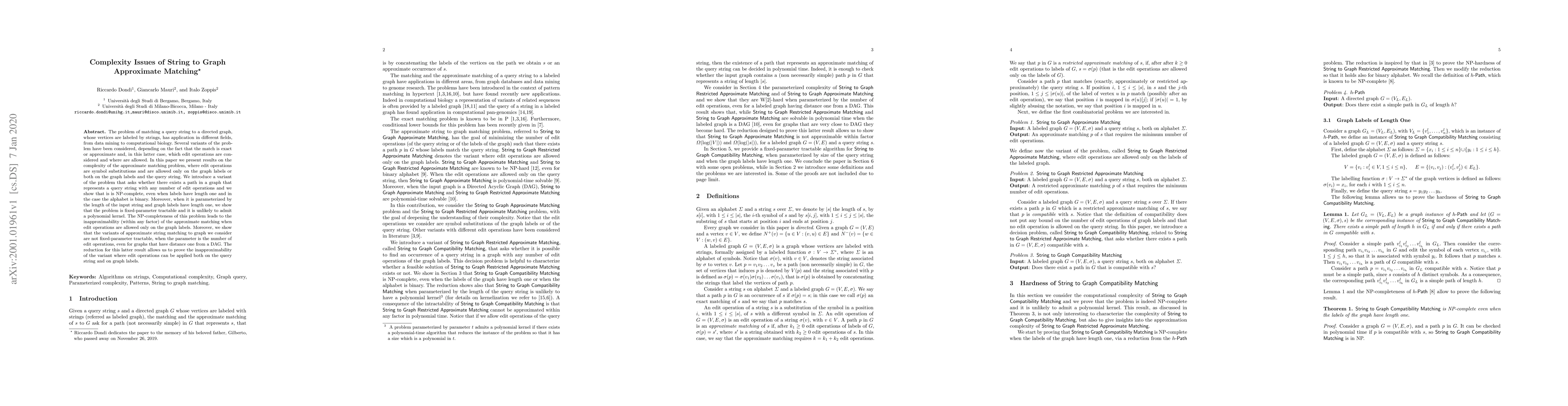This paper investigates the complexity of approximate matching between a query string and a directed graph where vertices are labeled by strings, focusing on symbol substitution edit operations. It demonstrates that the problem is NP-complete and inapproximable when edit operations are restricted to graph labels, while showing fixed-parameter tractability under certain conditions.
