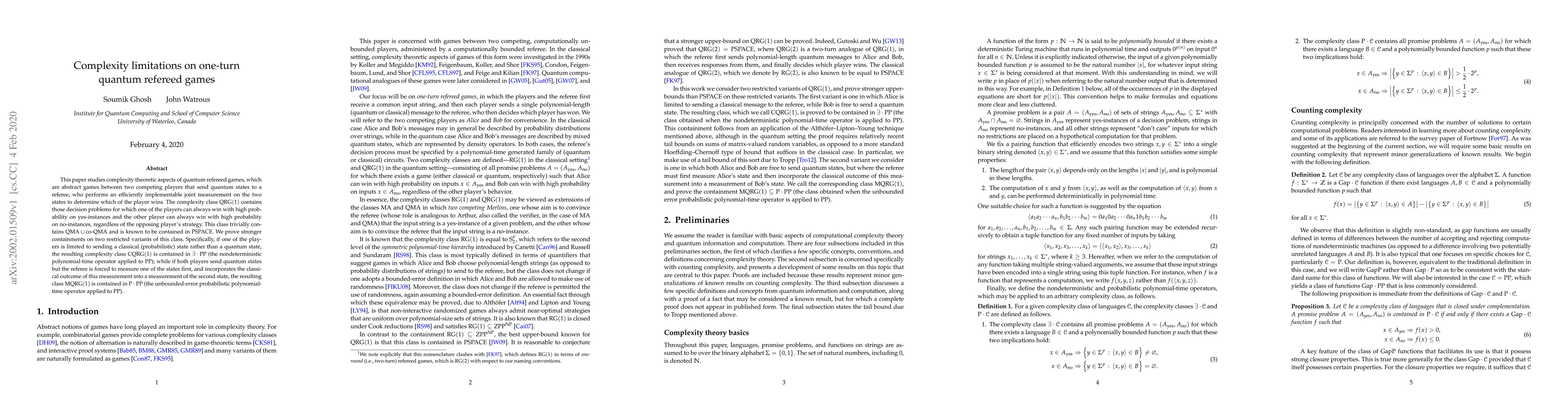 This paper studies complexity theoretic aspects of quantum refereed games, which are abstract games between two competing players that send quantum states to a referee, who performs an efficiently implementable joint measurement on the two states to determine which of the player wins. The complexity class $\mathrm{QRG}(1)$ contains those decision problems for which one of the players can always win with high probability on yes-instances and the other player can always win with high probability on no-instances, regardless of the opposing player's strategy. This class trivially contains $\mathrm{QMA} \cup \text{co-}\mathrm{QMA}$ and is known to be contained in $\mathrm{PSPACE}$. We prove stronger containments on two restricted variants of this class. Specifically, if one of the players is limited to sending a classical (probabilistic) state rather than a quantum state, the resulting complexity class $\mathrm{CQRG}(1)$ is contained in $\exists\cdot\mathrm{PP}$ (the nondeterministic polynomial-time operator applied to $\mathrm{PP}$); while if both players send quantum states but the referee is forced to measure one of the states first, and incorporates the classical outcome of this measurement into a measurement of the second state, the resulting class $\mathrm{MQRG}(1)$ is contained in $\mathrm{P}\cdot\mathrm{PP}$ (the unbounded-error probabilistic polynomial-time operator applied to $\mathrm{PP}$).