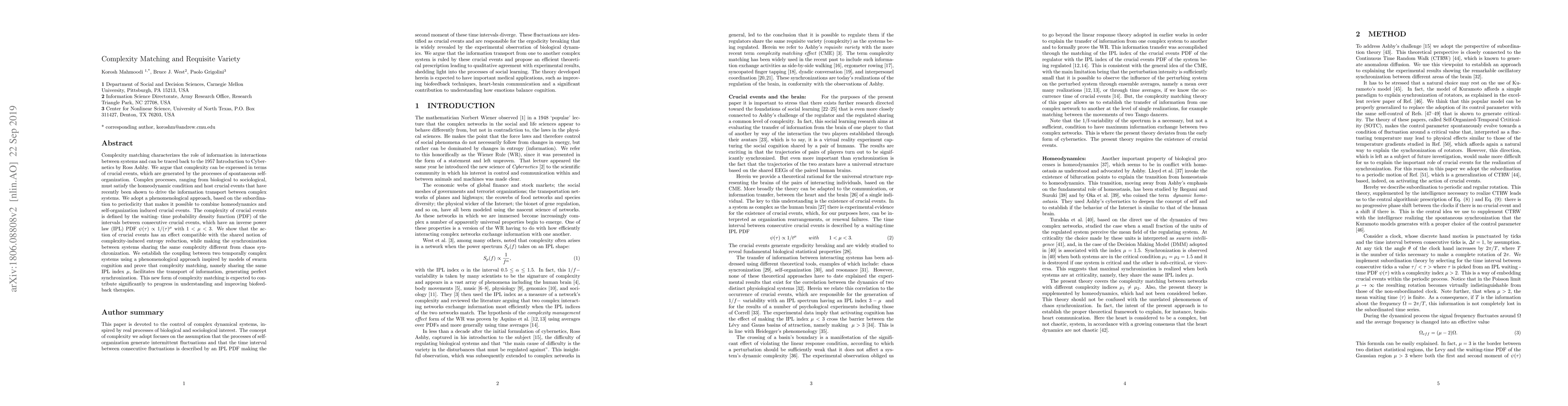 This paper explores complexity matching and requisite variety through crucial events generated by self-organization, emphasizing their role in information transport between complex systems. It demonstrates that matching the inverse power law index of crucial events leads to perfect synchronization, offering insights for biofeedback therapies.
